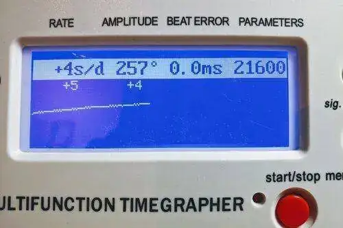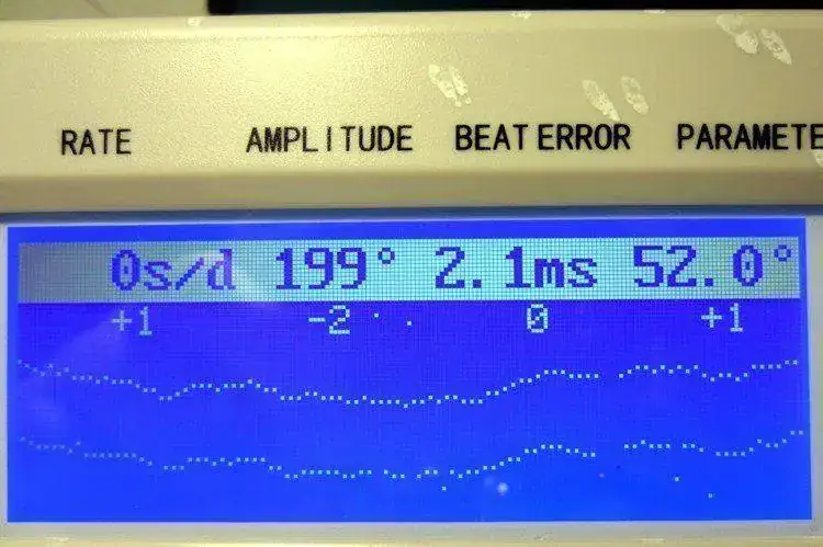 Esta sería una lectura muy buena, tenemos un desfase de solo 4 segundos, una amplitud muy buena, de más de 200º y un "beat error" imperceptible, que se lee como 0 en el contador y se representa como una sola línea aparente en el gráfico. En teoría, un funcionamiento óptimo del movimiento.