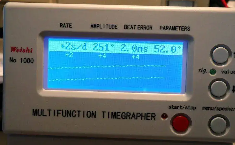 El tercer valor importante sería la amplitud, que mide la fuerza del muelle que llega al volante través del tren de rodaje haciéndolo girar con más o menos energía. Si la amplitud es baja, normalmente tenemos un movimiento que va a necesitar servicio, la energía se pierde por la resistencia de las piezas, ya sucias o secas y ralentizadas por la fricción, el desajuste o el desgaste. Es uno de los valores más importantes en las compras de relojes usados: si ves una muy baja amplitud, hay que contar con la necesidad de un servicio próximo o inmediato y por tanto tenerlo en cuenta en el precio de reloj y pensar si compensa.