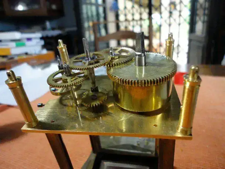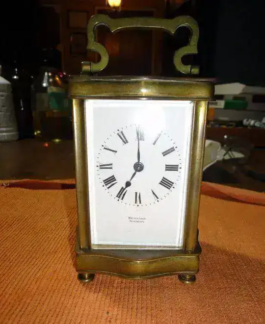 Por su belleza, adquirí un reloj de este tipo, su aspecto era bueno, aunque con el latón verdoso y las juntas de la caja con residuos blanquecinos de limpia-metales, señal que en algún tiempo estuvo cuidado. El reloj es del año 1880, en Francia lo conocen como “Pendule d'Officier dite Doucine” marque: Couaillet. Se comercializo en la relojería más importante de Burdeos.