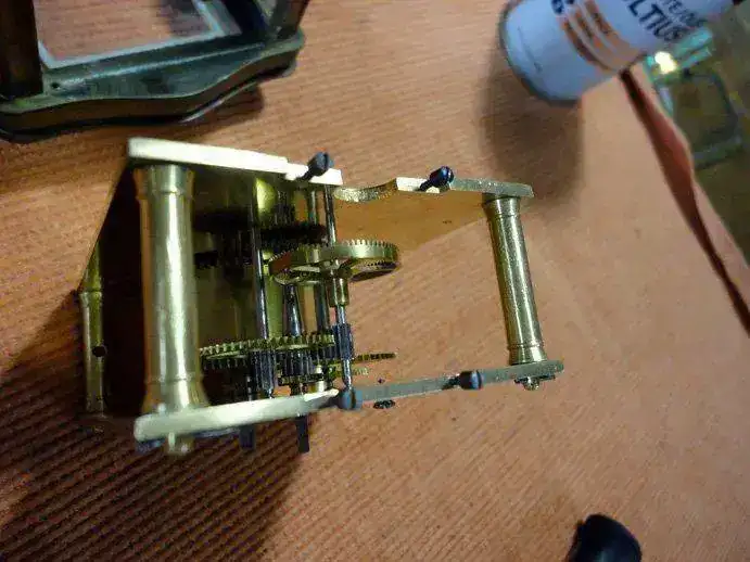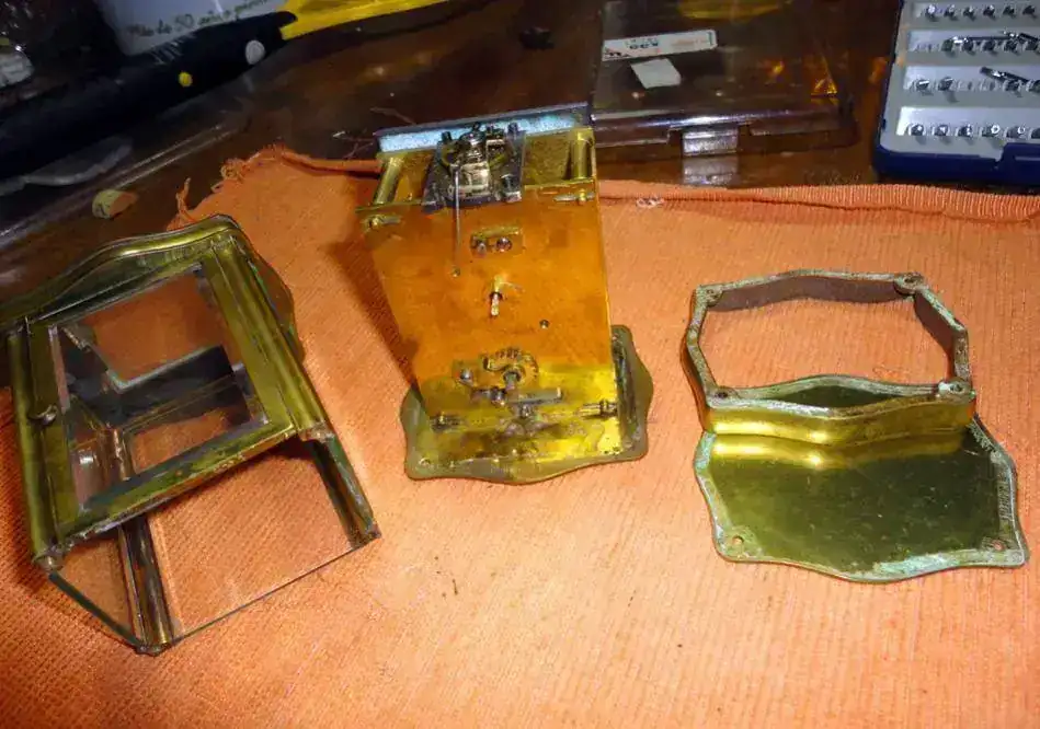 Procedo a desmontar la caja y cristales biselados para la limpieza del latón con liquido desoxidante y detergente, con un buen secado y bruñido con paño de algodón.