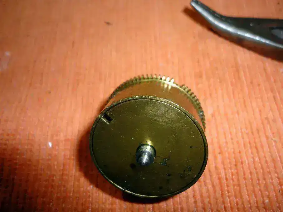 A primera vista, parecía que el escape de cilindro estaba en perfecto estado, pero mucha suciedad y, como atascado, no mostraba la menor señal de movimiento. Al observar las ruedas, el barrilete del muelle real tenía dos dientes rotos.