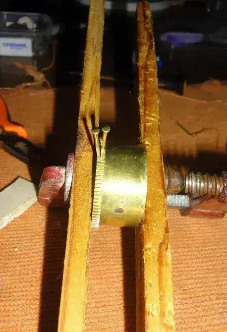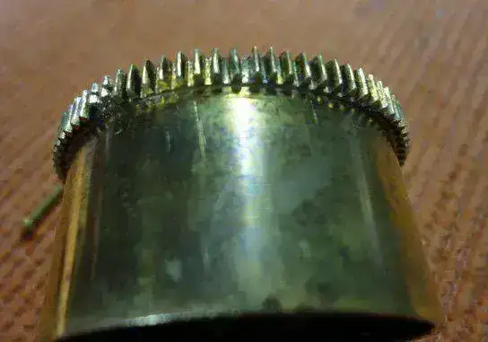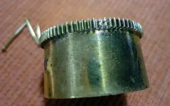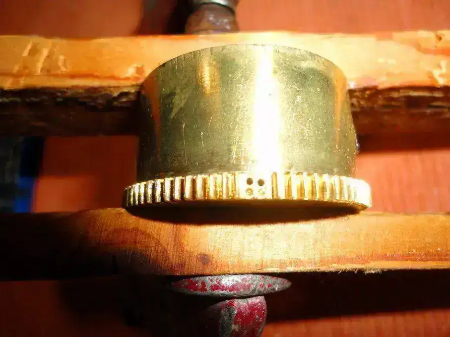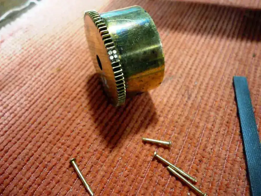 El barrilete una vez desmontado y limpio, le reconstruyo los dos dientes que faltan, con cuatro taladros, dos en el lugar de cada diente y, encajo unos clavos de latón que con unas gotas de estaño fijo, después, con finas limas doy forma de diente a cada par de clavos hasta que quedan perfectamente ajustados y sustituyen los dientes que faltaban. Vuelvo a colocar el muelle real, lo aceito y cierro el barrilete.
