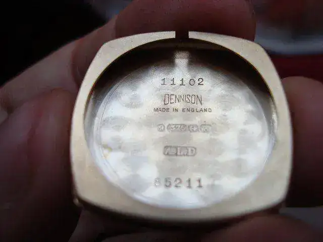 Como se ve en una de las fotografías adjuntas la tapa trasera está firmada por Dennison, debajo pone Made in England, debajo presenta dos números seguidos de un ancla (símbolo de Birminghan) y otro número. Debajo las Iniciales A.L.D. y por último el numero de fabricación de la caja. Esta pequeña pieza forma parte de la historia de los inicios de los relojes de pulsera.