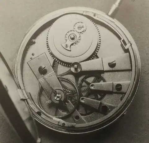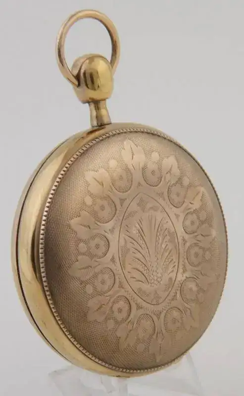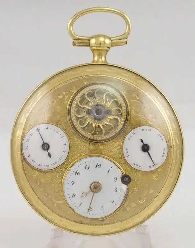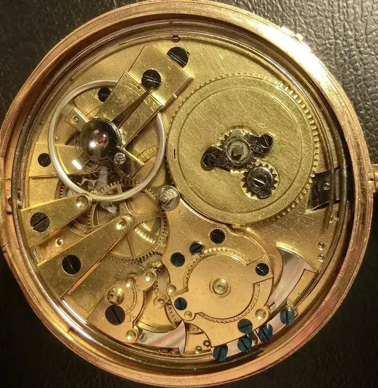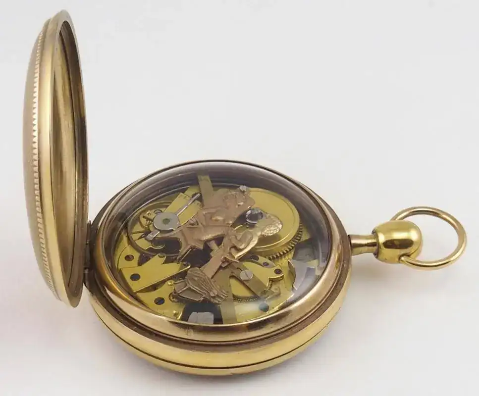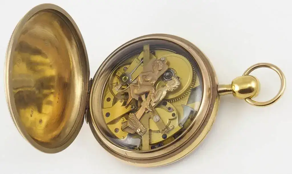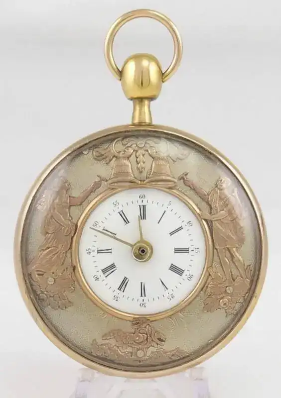 Caja en oro 18k con grabado guilloché y adorno con motivos vegetales. Con sonreía a cuartos y tres autómatas. Lepine. Guardapolvo de cristal sintético, con perforación para dar cuerda. Toca por petición por pulsador, a las 12, las horas y los cuartos. ESFERA: En latón dorado con una pareja Martin y Martina, situados a ambos lados de la esfera, que simulan tocar las campanas al ritmo de la sonreía. Cuadrante central en esmalte blanco sobre cobre, numeración romana. MÁQUINA: En latón dorado, calibre Lepine I mejorado. Regulador de velocidad de sonreía, adelanto y retraso. Dispone de autómatas sobre la máquina con escena picaresca que se mueve al ritmo de la sonreía. ESCAPE: De cilindro de acero bruñido. Calibre I. TAMAÑO: 60 mm. Peso: 136 gramos.