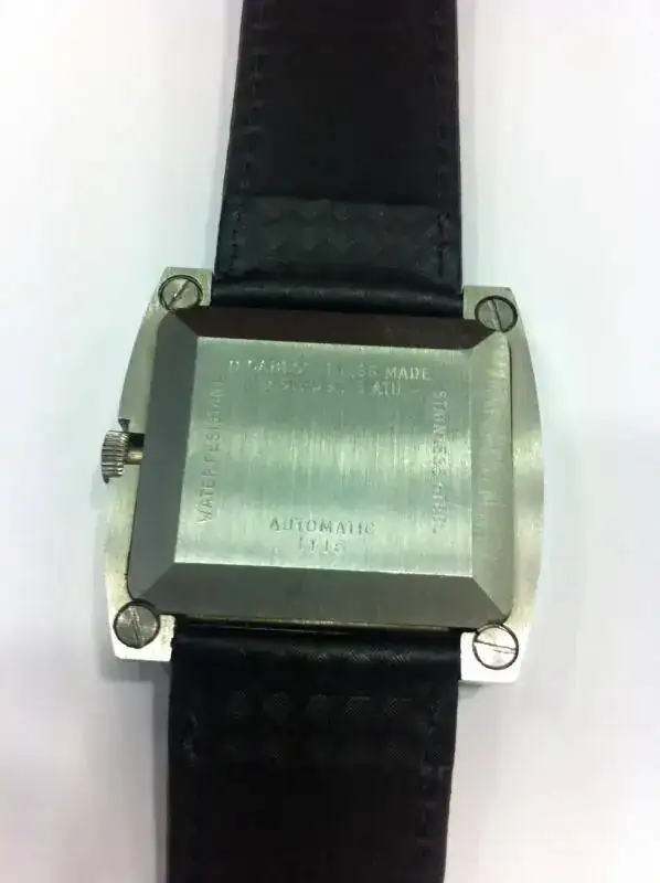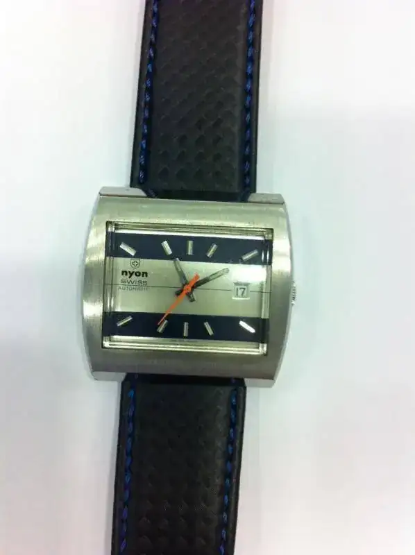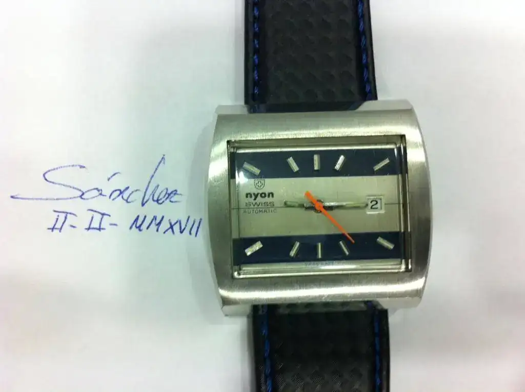 Reloj marca Nyon en estado casi NOS y no digo NOS al 100% porque lo usé yo una semana en casa para comprobar su marcha. Caja de acero de 39x37mm. No sé que movimiento automático lleva dentro. Solo puedo decir que es de frecuencia baja, de 21600 A/h, pero no sería descabellado decir que será un ETA o AS. El cambio de fecha es rápido. La caja como digo, es toda de acero, y lleva 4 tornillos en la trasera. Funciona perfectamente aunque sería conveniente (tiene algo de atraso) hacerle un servicio ya que debe llevar más de 30 años guardado. Correa de 24mm de ancho con un uso de no más de una semana.
