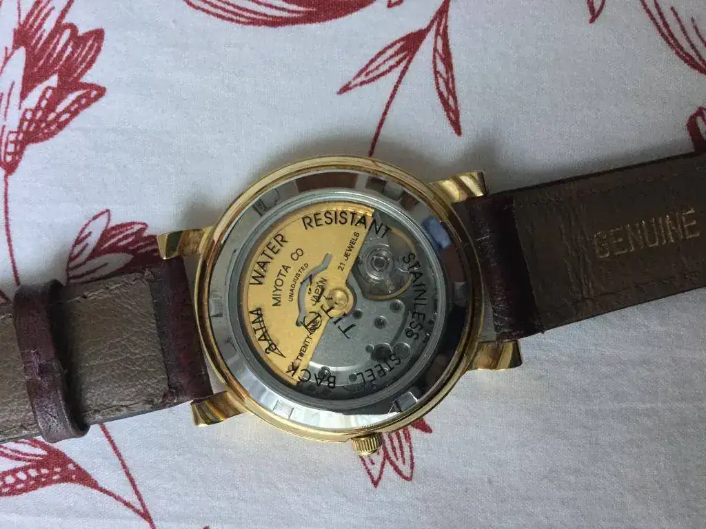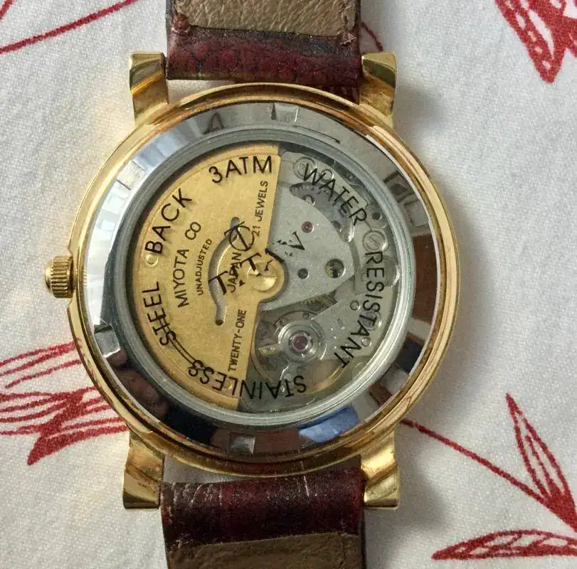 Movimiento japonés marca Miyota de 21 rubíes. Tiene el fondo visto.