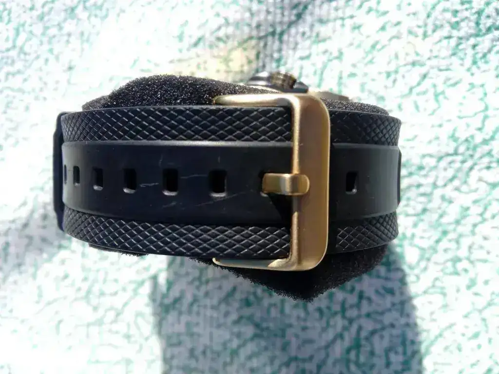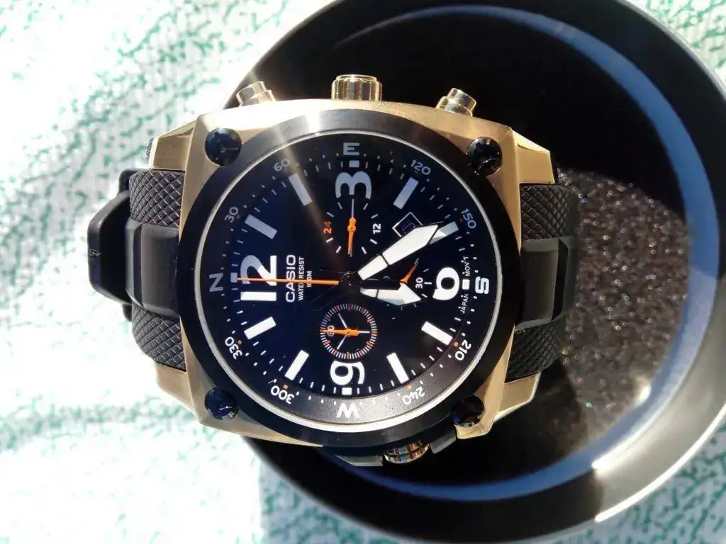 Es un reloj contundente,con sus contundentes 45 mm. de caja (sin coronas).