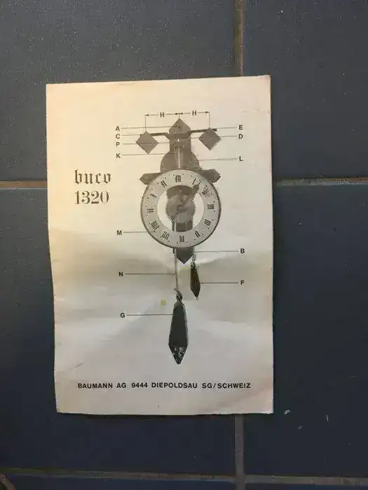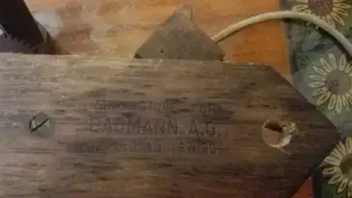 En la pletina o madera la marca Baumann A.G. y modelo ,,buco 1320,, se supone que es el año de la imitación, el fabricante disponía de varios modelos con distintos tipos de escape creo que 4 modelos y vendidos sobre los años 1950 y posterior,, muchos de los Españoles que fueron a suiza a trabajar se traían uno de recuerdo, tanto es lo que gusto aquí que en una revista de la época "Mecanica Popular" el numero de Noviembre del año 1964 se indicaba como fabricarse uno con planos y explicaciones,,
