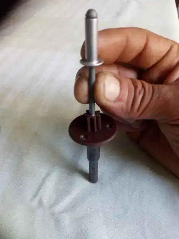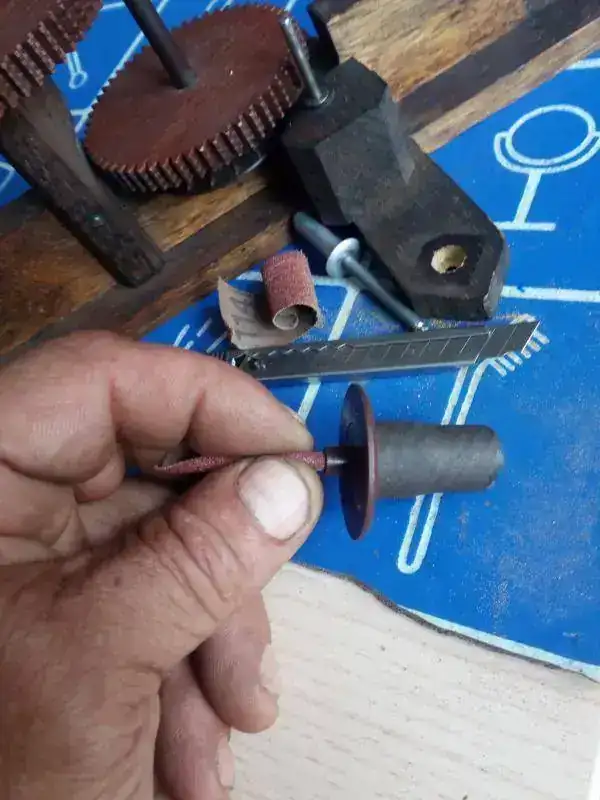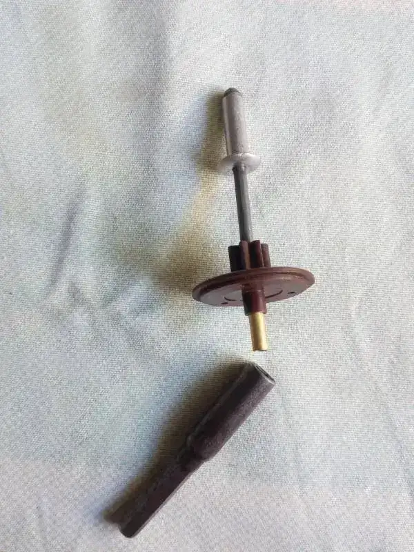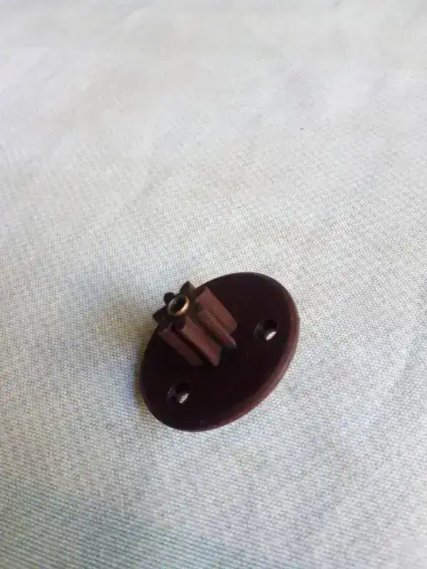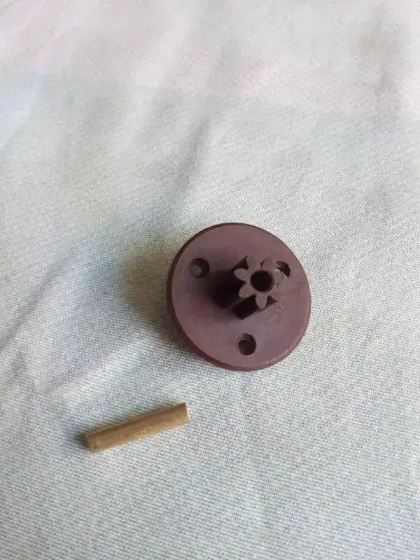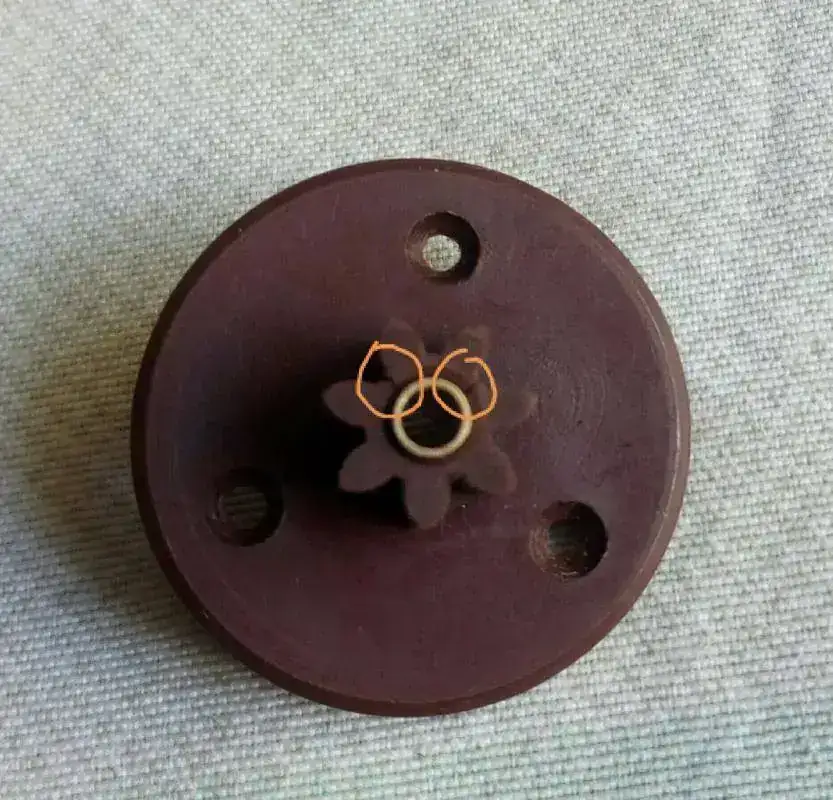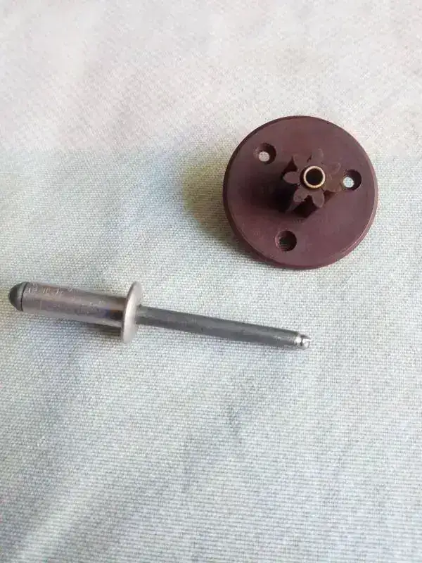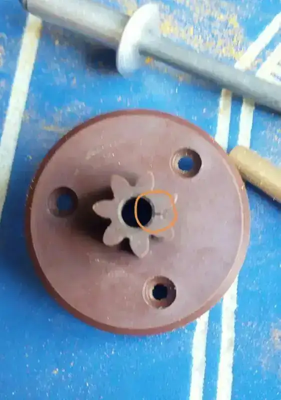 Desmontando el casquillo metalico y bien lijado el plástico hasta meterlo sin esfuerzo y con la ayuda de un trozo de manguera goma de aire a presión abrace el exterior del engranaje para devolverlo a su medida original, después encolarlo por dentro metiendo el casquillo metalico de nuevo, atornillar la pieza en la rueda de madera y montar el rodaje completo,,, aquí el hilo de arriba hace de muelle y ajustando su largo se hace coincidir las paletas con la rueda de escape ""la de palitos""