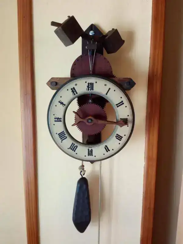 Hola amigos, tengo este suizo que representa una replica de un reloj medieval verge foliot me llego bastante destartalado, aquí aplique unas nociones de carpintería cola blanca, hilos nuevos y a funcionar, pero se paraba en dos minutos, y casi lo echo al fuego pues lo daba por perdido,, pero como buen relojero la paciencia es la madre de la ciencia,, le dedique unas horas, y el resultado fue que gasta toda la cuerda sin parar, eso si cada dia hay que subir el peso,, me parece buen reloj para contar la historia relojera, pues dicen que este escape es el mas antiguo conocido en mecánica relojera hay escritos de por el año 1275, que existe o que fue diseñado y del ruido que hace desde entonces se conoce el tic-tac tic-tac, en Francia le apodaron el loquito pues parece que lo este, con ese va y ven que tiene,, los ingleses lo aplicaron a los relojes de torre, siendo las primeras maquinas que marcaron las horas, y digo las horas pues carecen de aguja de minutos, invento que fue añadido posteriormente,,