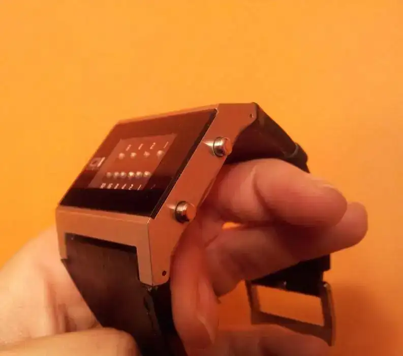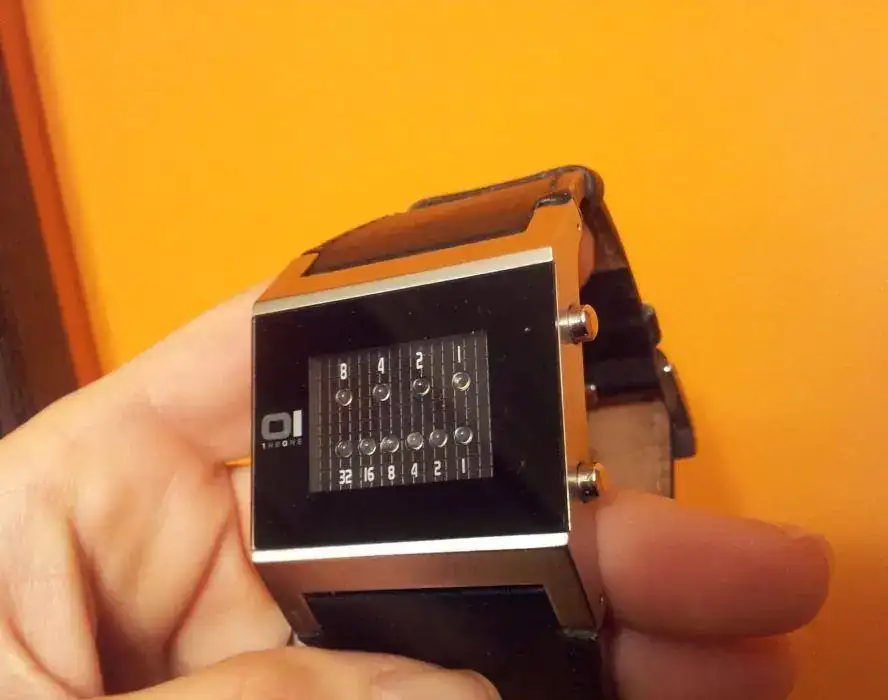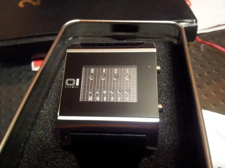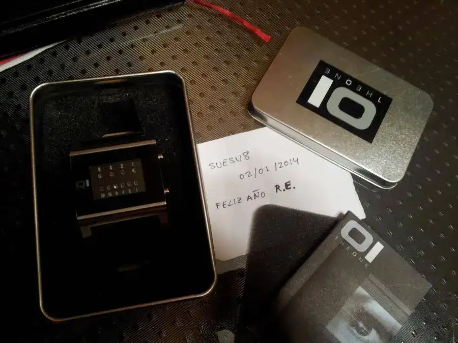 Debido a las últimas entradas, saco a la venta este original cuarzo. Da la hora mediante leds azules cuando se pulsa el botón, de manera que la fila de arriba indica las horas y la de abajo los minutos.Si no pulsas, las luces están apagadas. Las motitas que se ven en la foto es polvo, no le pasa nada al cristal (le pasé un pañito y se volvieron a posar