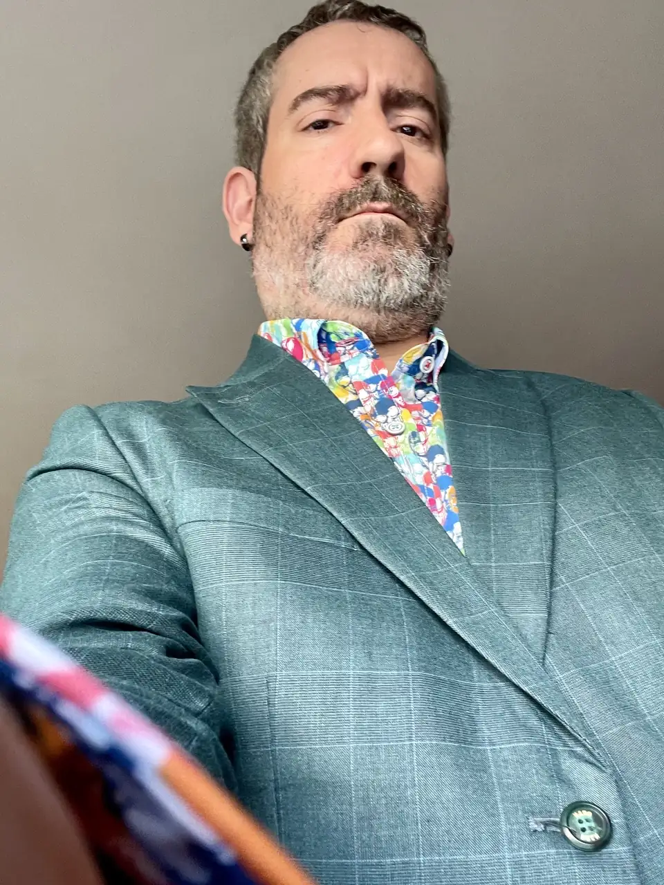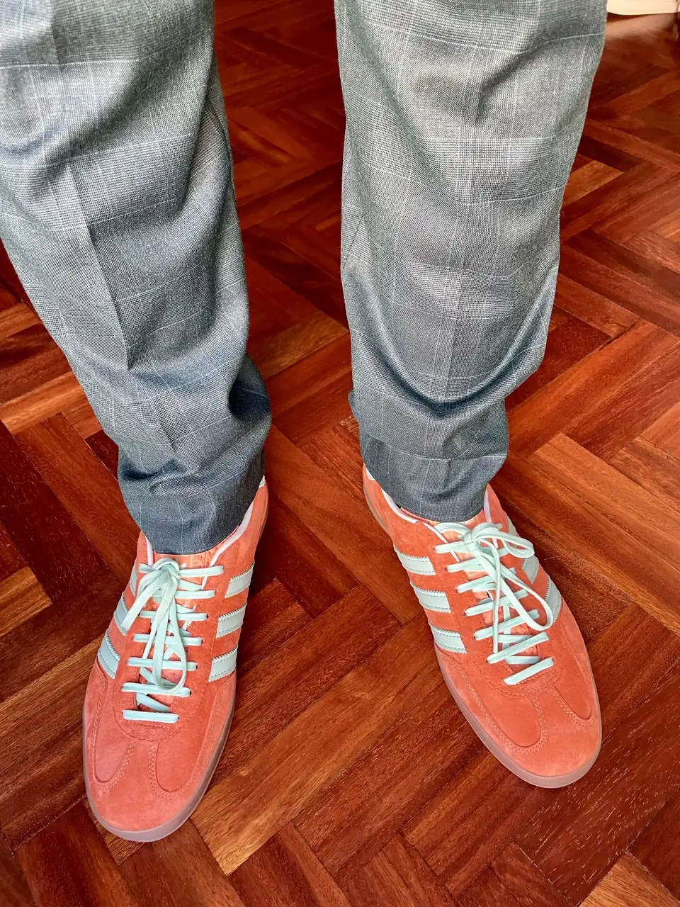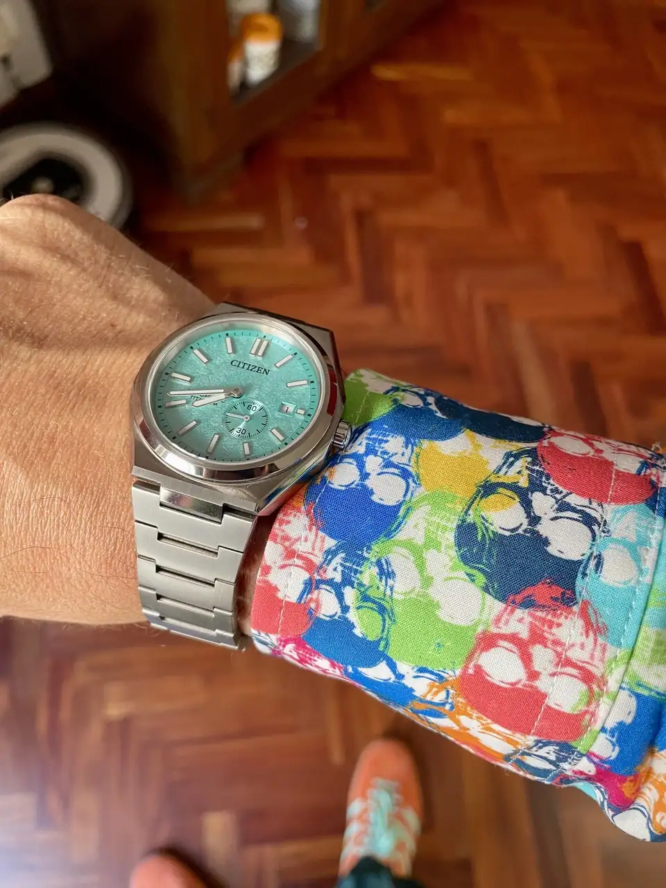Las fotos no le hacen justicia pero aquí va el traje(color verde/azul/cada uno ve un color distinto con un fino tartán) y la camisa blanca con un montón de colores entre los cuales se incluyen el Tiffany del reloj y el naranja de las zapatillas, es una combinación para una boda de temática de música en acústico y al aire libre en los jardines de un pazo en Galicia al lado de la playa y costa de las rías baixas