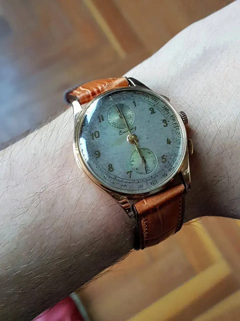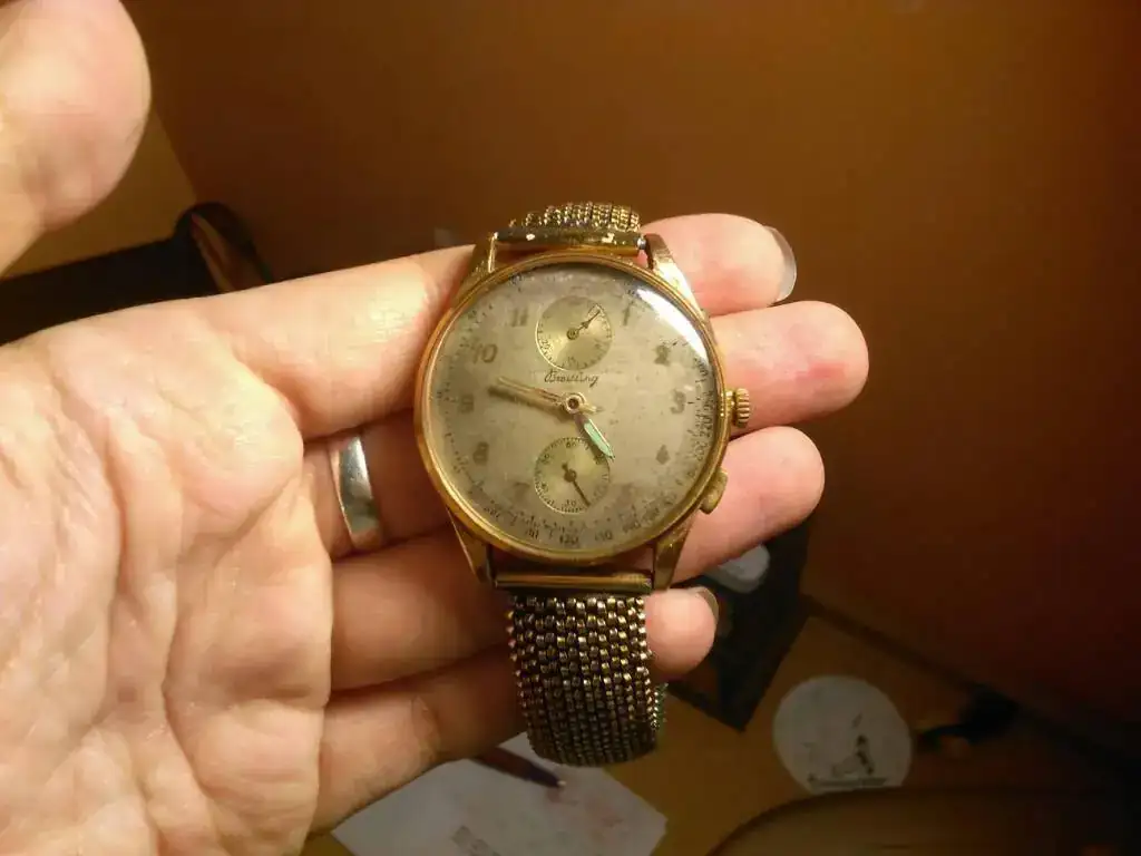 Por lo que he podido averiguar, Breitling creó y aplicó el cronógrafo allá por 1934, y el doble pulsador a las 2 y 4 h es posterior, así que debería ser de los años 40 por estética a mi entender. Justo escribiendo acabo de encontrar un modelo muy muy similar en venta en Pamono https://www.pamono.es/reloj-cronografo-venus-170-de-oro-de-breitling-a-os-40, así que deduzco que podría tratarse de un Venus 170 no?