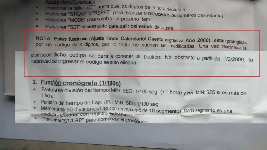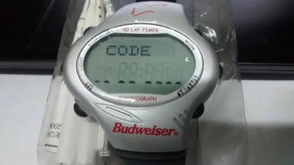 Buenas gente, este es un reloj de una promocion del año 2000, esta nuevo en su caja y con su etiquete y film pero lo que siempre me tuvo en la intriga es que presionando un boton en el menu del calendario se accede a una funcion en la que pide un codigo (?), al parecer hay que dar ingreso a un codigo numerico que por la disposicion de los caracteres parece tratarse de una fecha pero en fin es solo una idea, si alguien tiene algo que aportar sera bienvenido