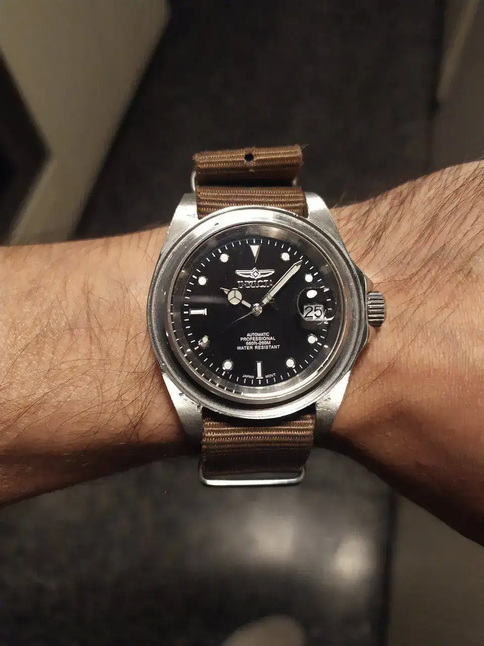Pero finalmente me he decantado por quitarle el bisel a un Komandirskie que tenía braseado, el cual poseía ese bisel giratorio que no sirve para nada, y el resultado ha sido el siguiente: