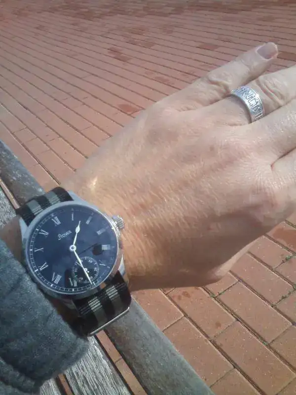 Los Stowa con cuerda manual montan una Unitas decorada, con regulador de cuello de cisne y volante con contrapesos atornillados.