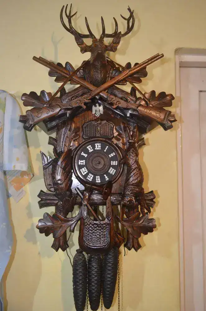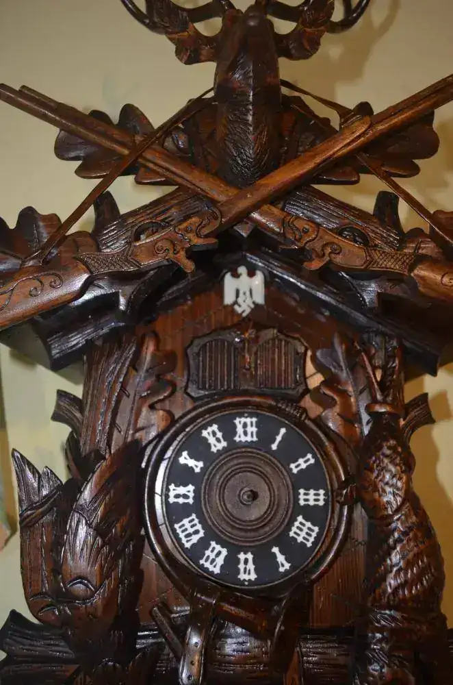 Buenas a la peña. Quería mostraros este curioso reloj cucu quail que estoy restaurando. Lo Extraño es el emblema con un águila imperial y la esvastica del frente. El emblema estaba escondido en la caja, pegado con cinta en la parte interna del techo y salió en la restauració. Parece estar hecho de hueso o marfil.
