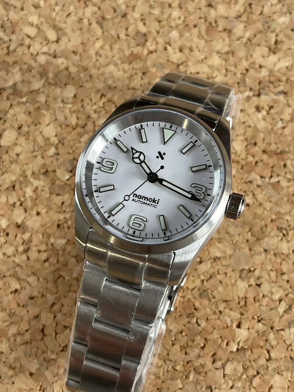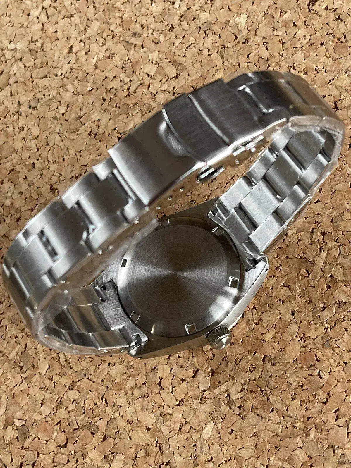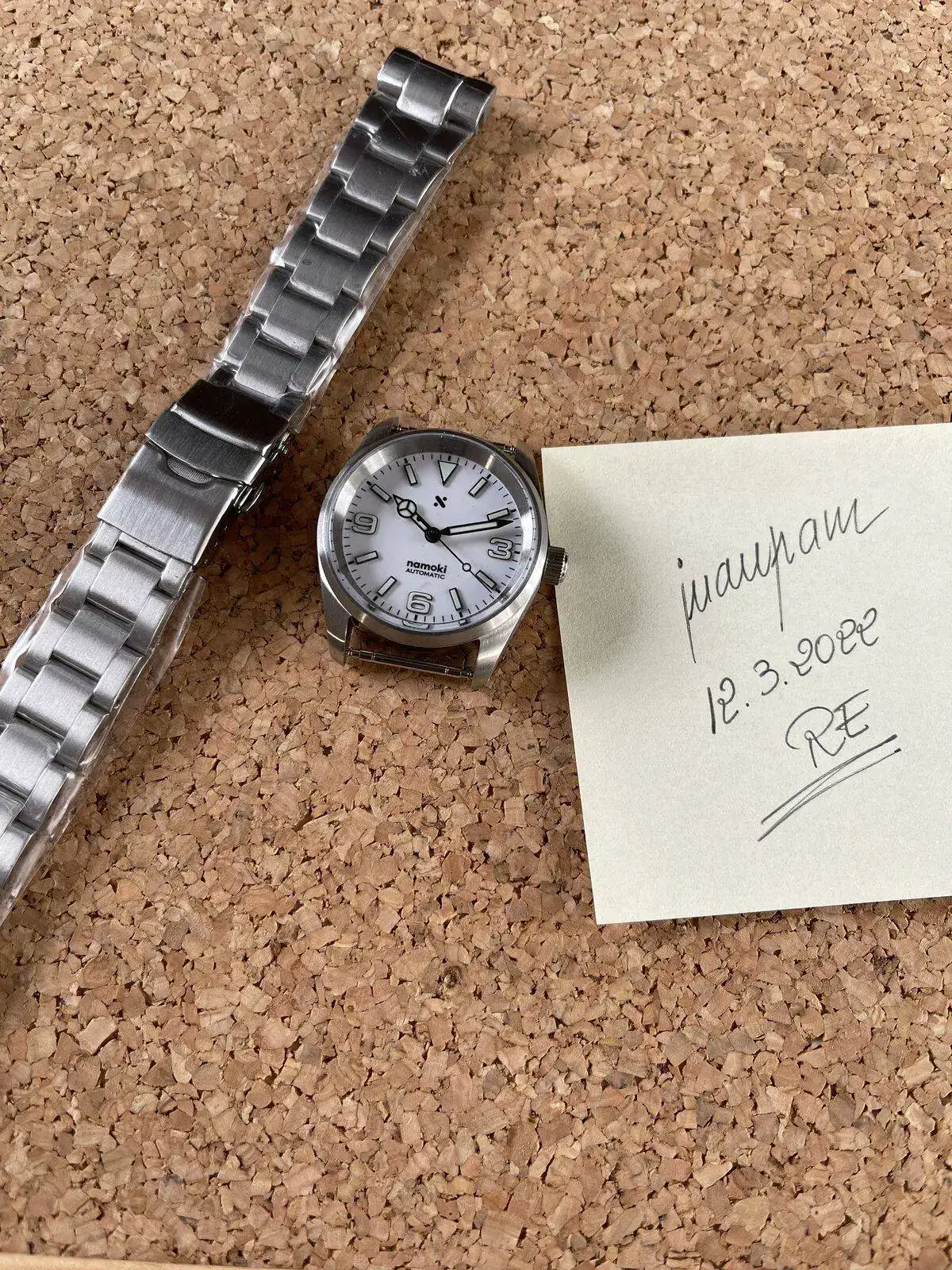 Lo que en principio planifique como construcción de reloj intocable, al final sale a la venta sin uso ninguno, se trata de un reloj con caja tipo field (militar) de tamaño muy contenido (36mm sin corona) pero que en la muñeca se ve más grande por la ausencia de insert. Su acabado es totalmente cepillado, Cristal de zafiro, corona roscada con triple junta engrasada, tapa trasera roscada con junta también engrasada, brazalete con eslabones de ajuste atornillados, endlinks macizos, dial blanco de Namokies, agujas de Namokies y movimiento automático Seiko nh35