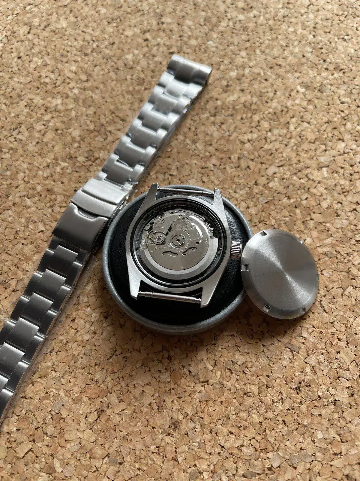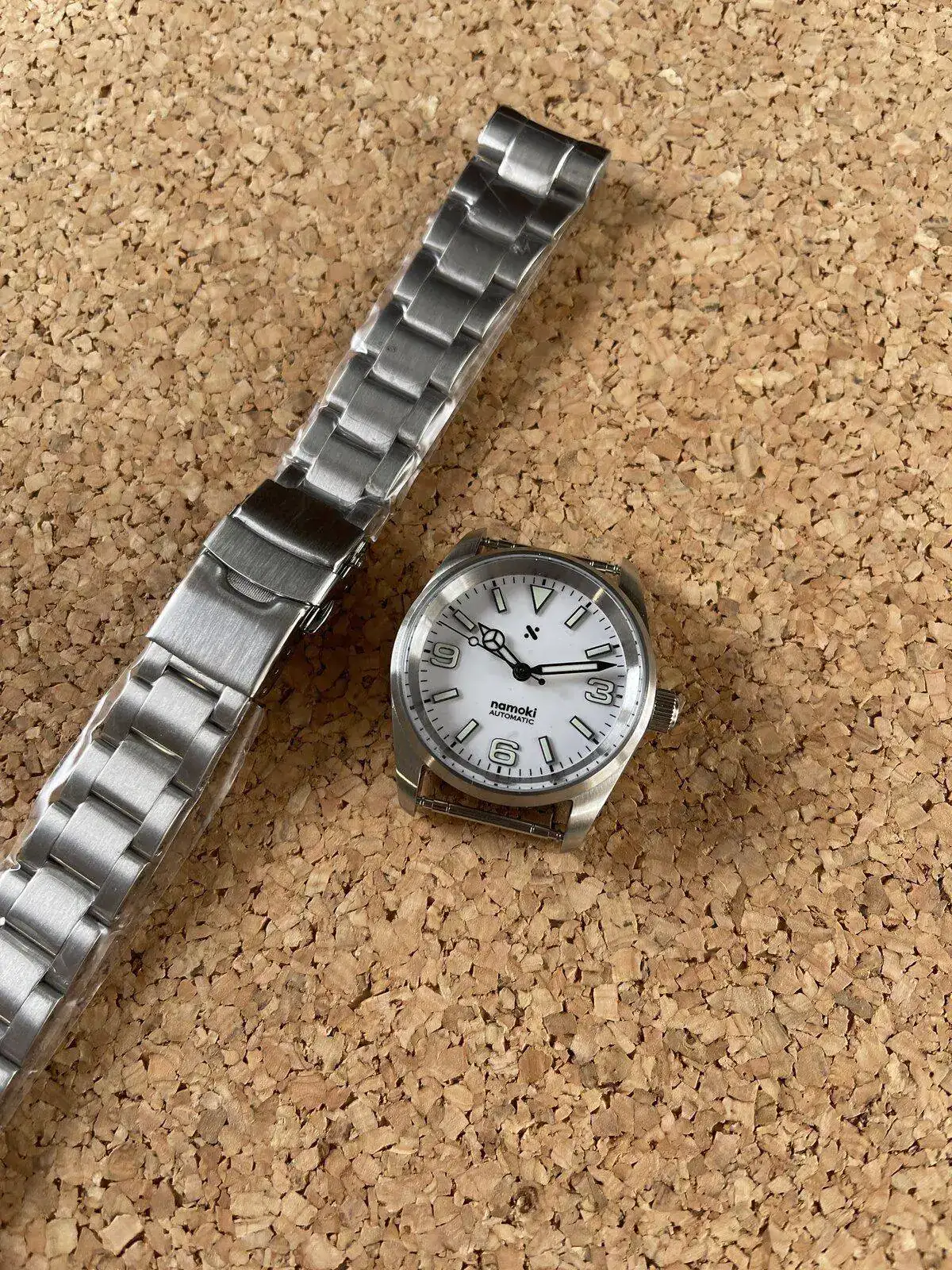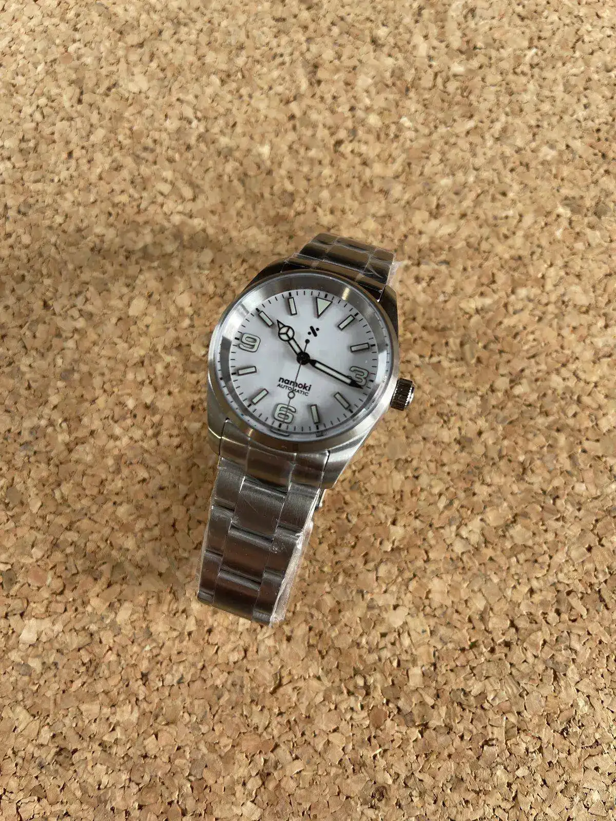 Lo que en principio planifique como construcción de reloj intocable, al final sale a la venta sin uso ninguno, se trata de un reloj con caja tipo field (militar) de tamaño muy contenido (36mm sin corona) pero que en la muñeca se ve más grande por la ausencia de insert. Su acabado es totalmente cepillado, Cristal de zafiro, corona roscada con triple junta engrasada, tapa trasera roscada con junta también engrasada, brazalete con eslabones de ajuste atornillados, endlinks macizos, dial blanco de Namokies, agujas de Namokies y movimiento automático Seiko nh35