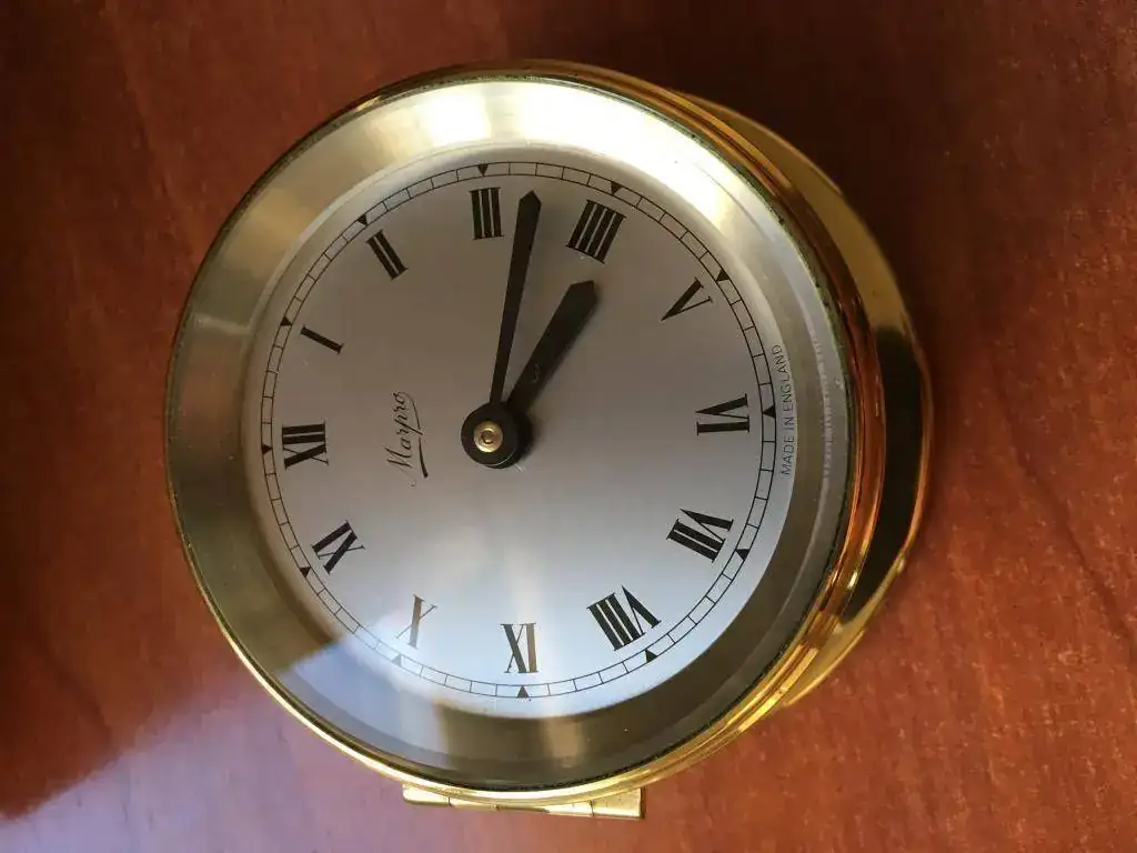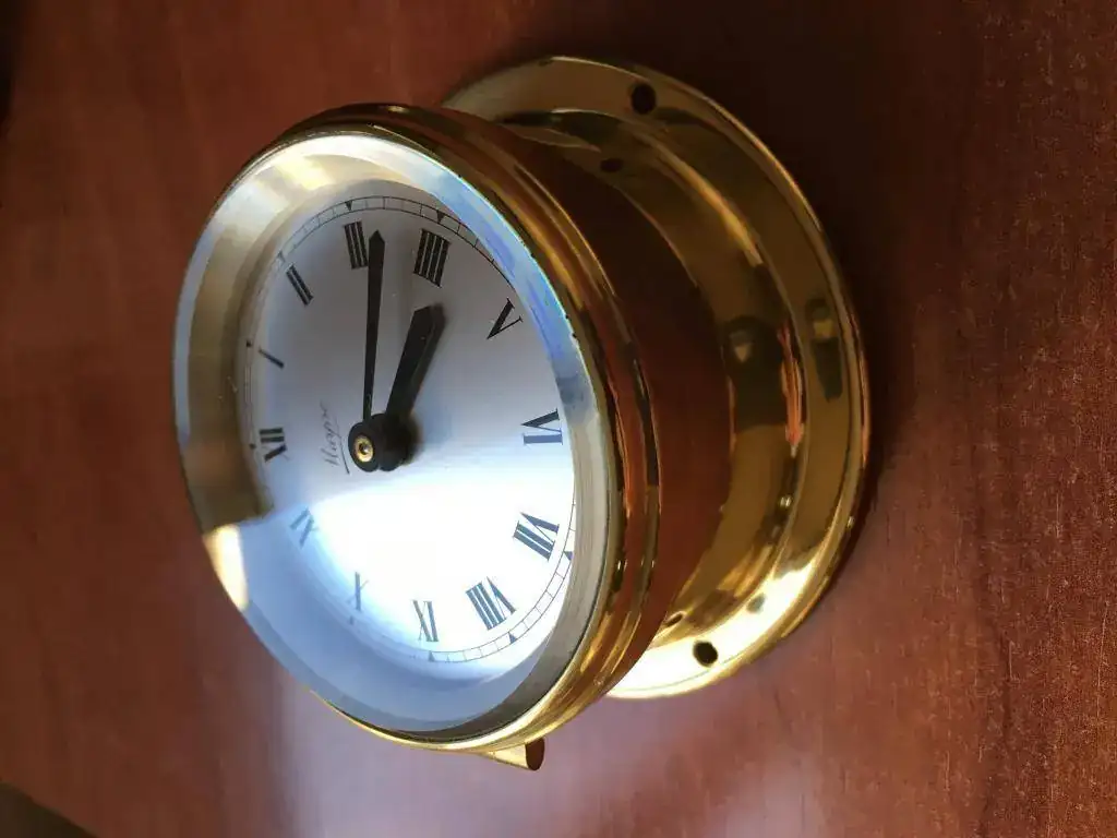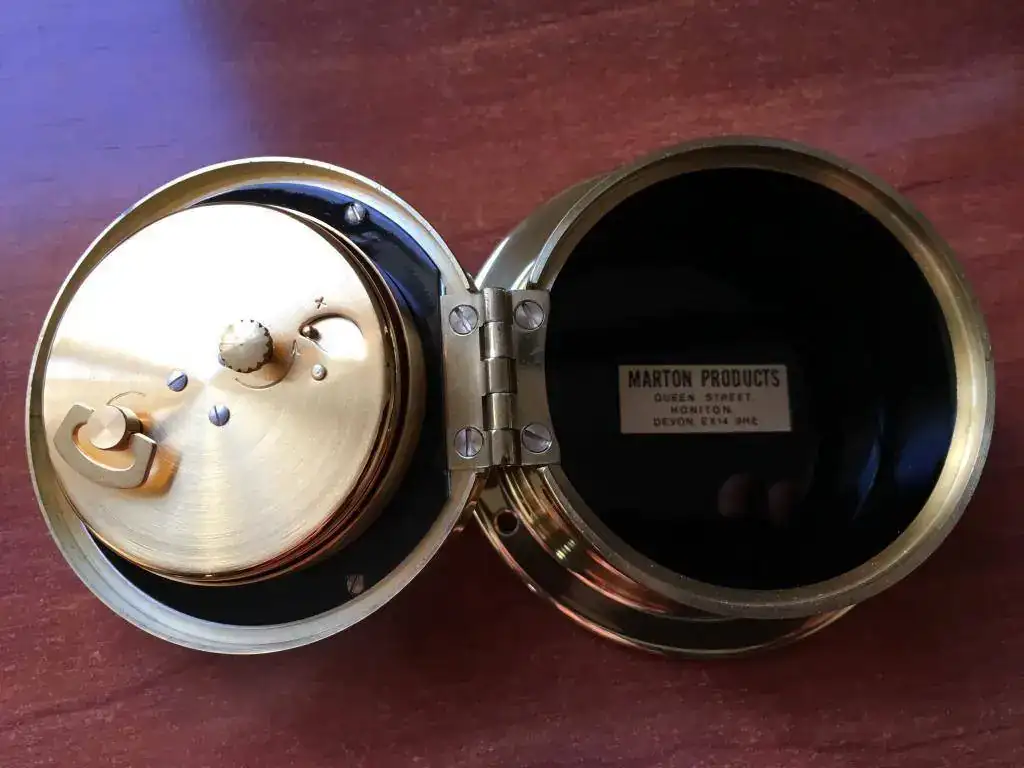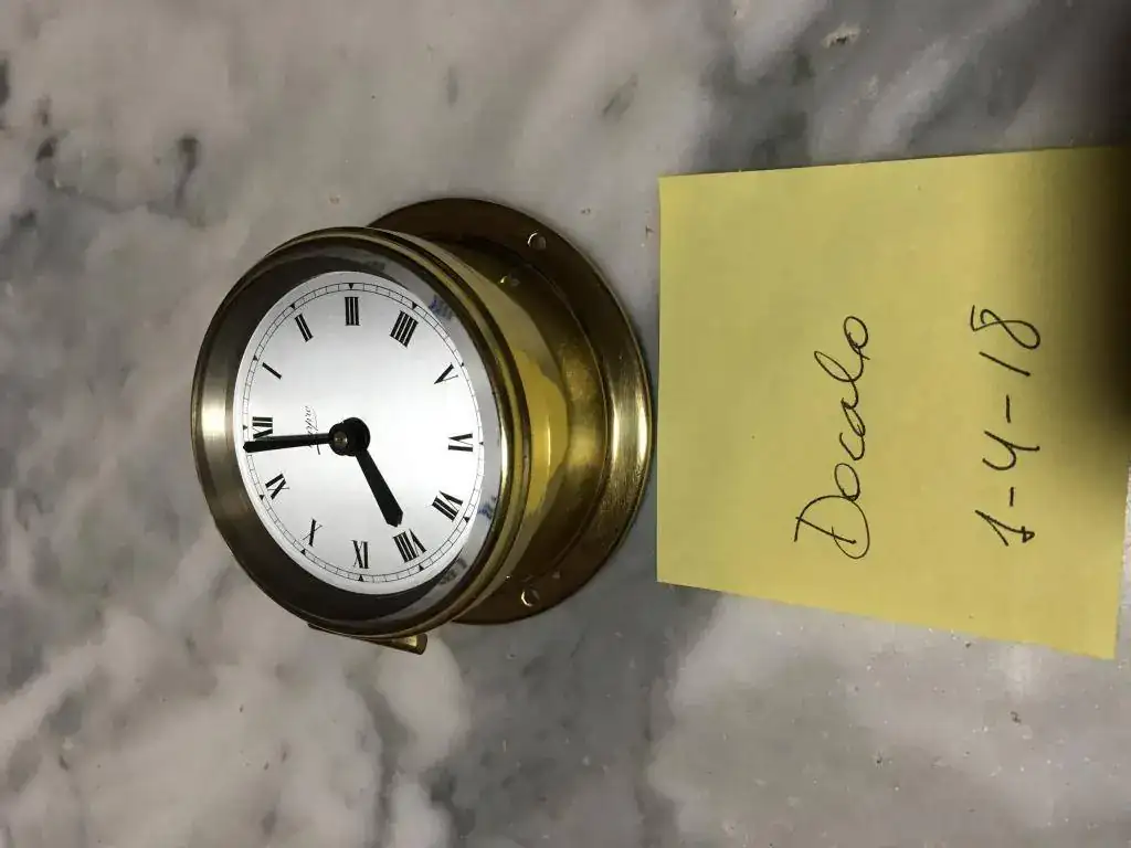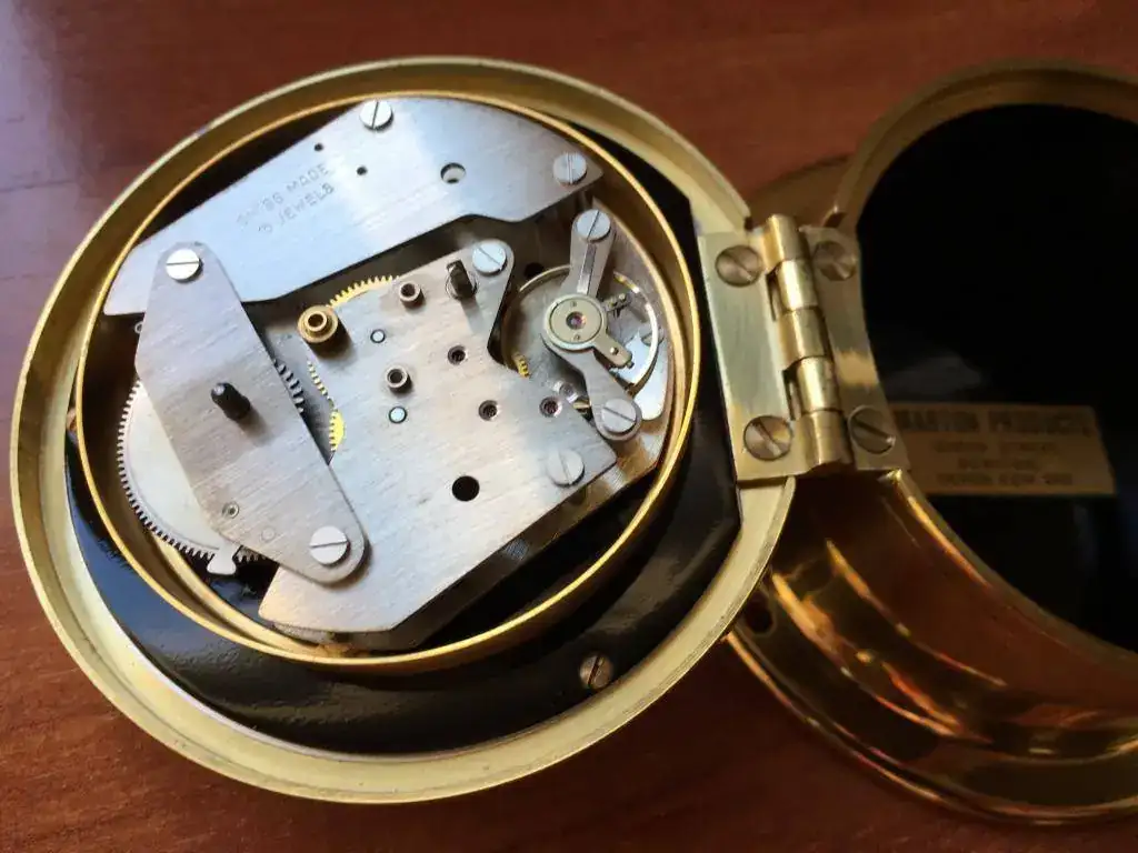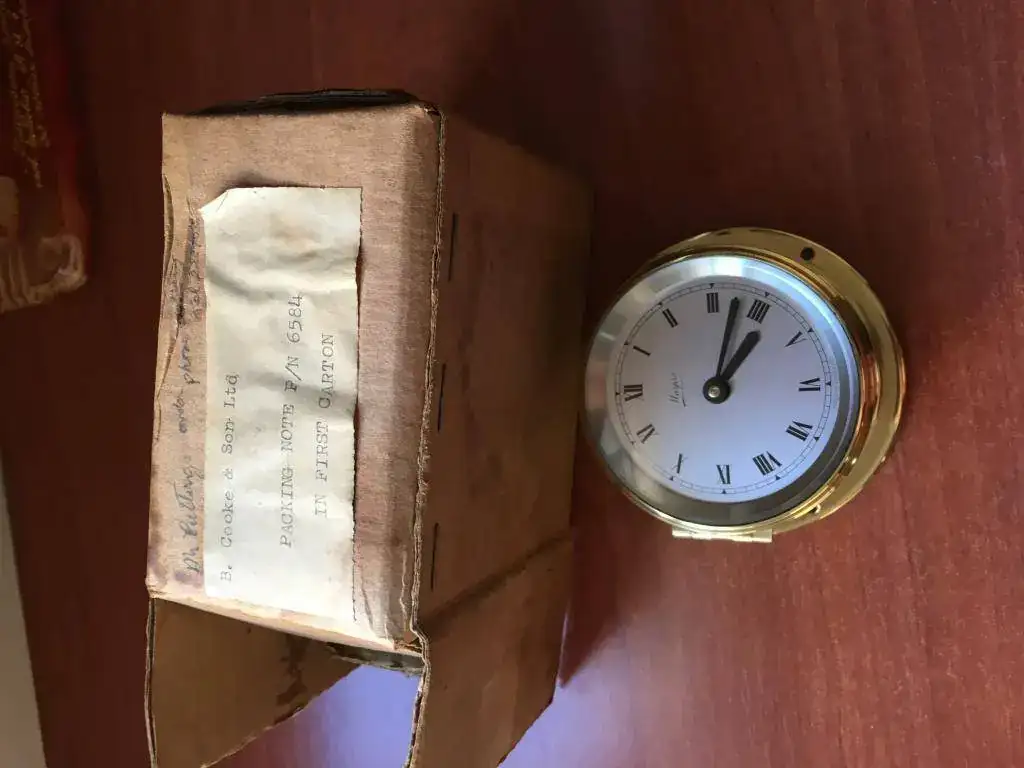 reloj de barco fabricado en Reino Unido en los años 50, tiene maquinaria de cuerda de 8 dias con 15 rubíes fabricada en suiza, cristal biselado y caja de bronce que mide 9x4cm. El reloj nunca ha sido usado y tiene su caja original. Funciona perfectamente.