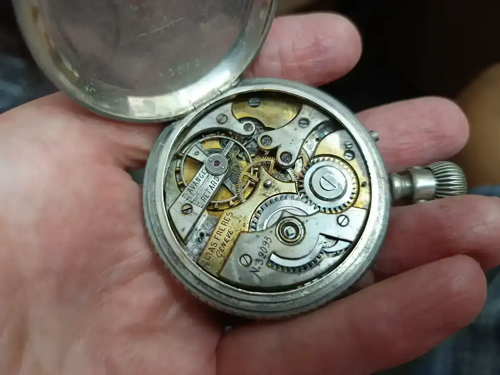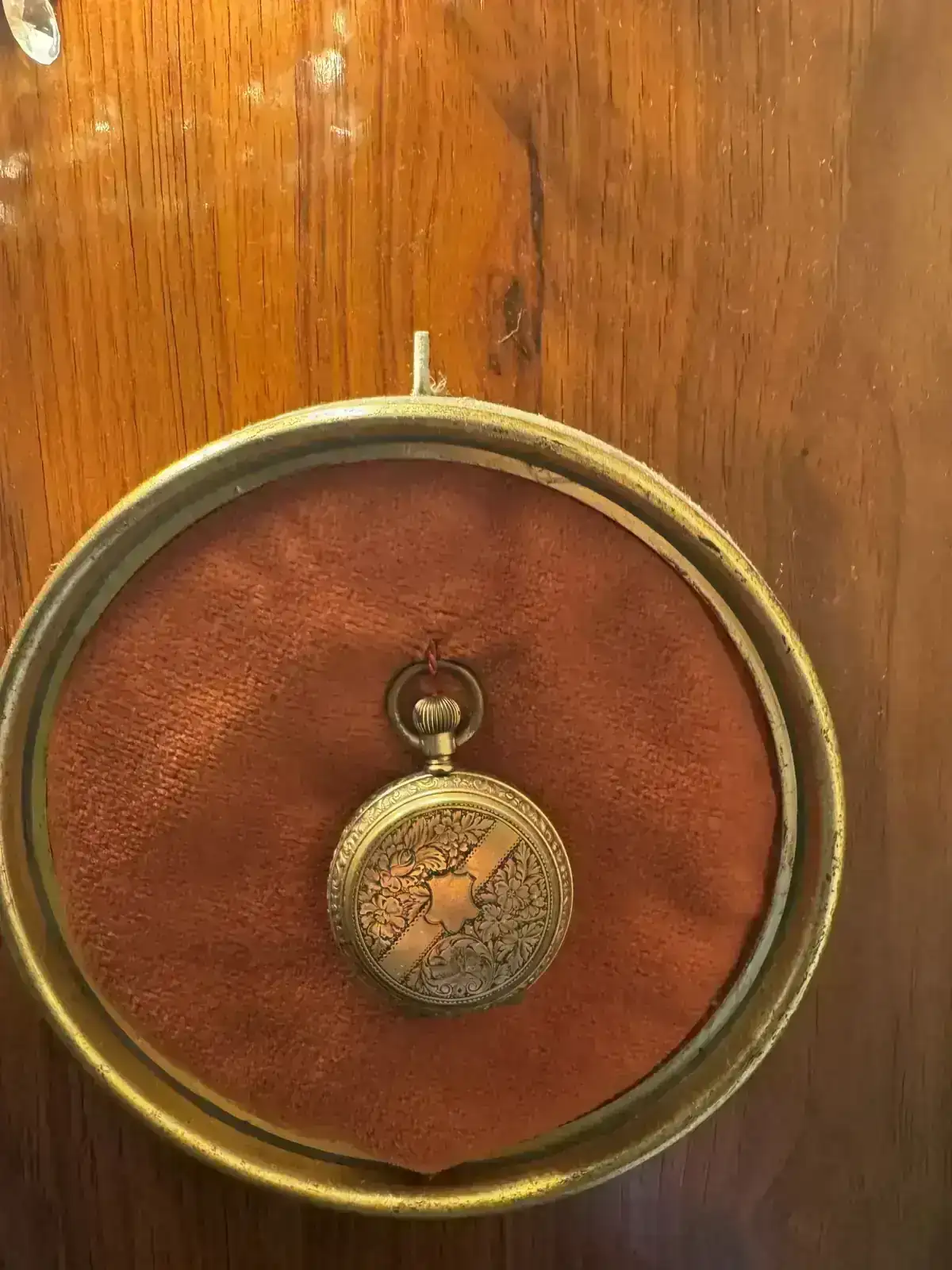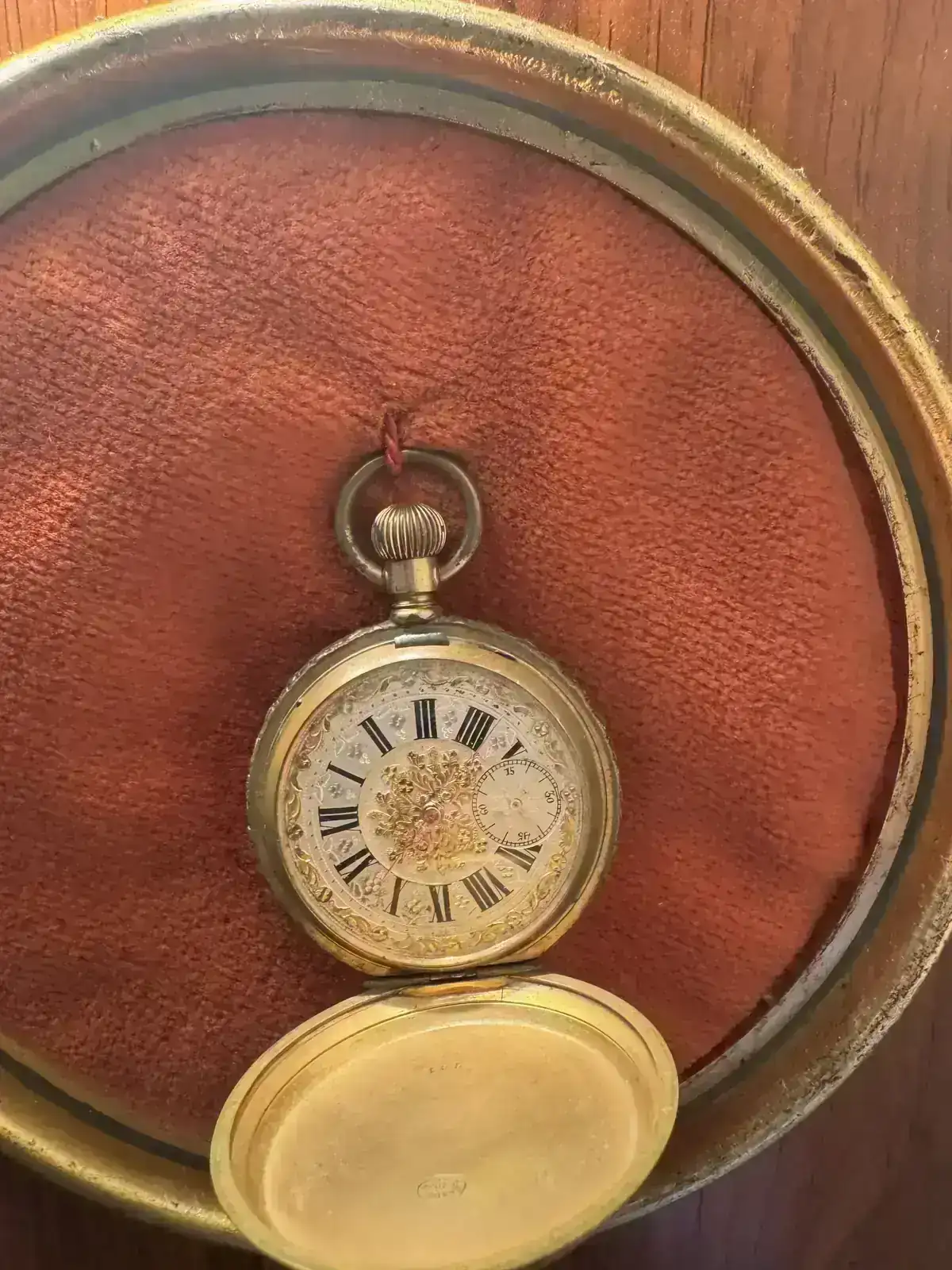 Buenas noches, primero disculparme por las fotos tan escasas, prometo conseguir mas y con detalle, necesito tomarme un rato para soltarlo del cuadro donde esta y abrirlo con tranquilidad, pero por adelantarme un poco, a ver si alguien podria tener alguna idea de que reloj se trata, aparte de estas como digo pobres fotos, lo único que puedo contar es que la maquinaria es 19 joyas y que tiene inscripciones en lo que creo es frances, ademas creo que era de mi tatarabuelo, por lo que el reloj tendría mas de 150 años fácil, aunque esto ultimo no lo puedo confirmar al 100%, juraria que mi abuelo en una ocasion me lo comento, pero no puedo asegurarlo.