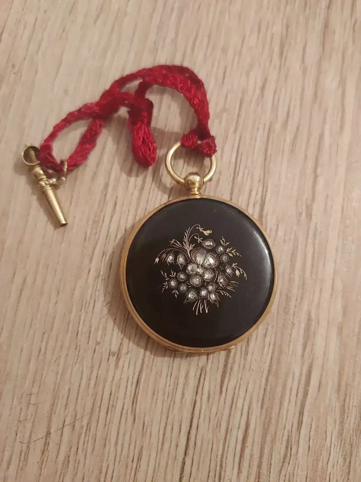 Es un reloj de bolsillo "SABONETA" de cuatro piezas para mujeres de los an 1850-1880, en su dia lo tenia probalemente una cardena "matching" con este reloj para llevarlo colgado en el cuello. El reloj debe tener unos 30 milimetros de diametro.