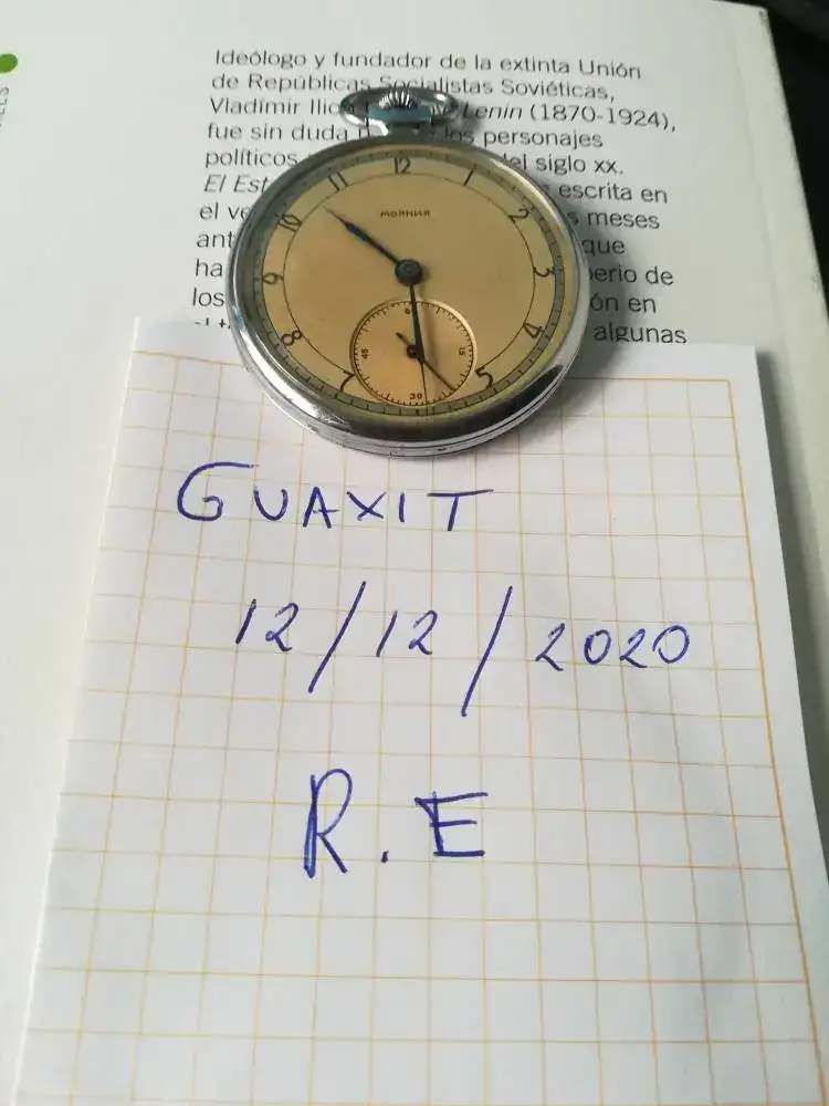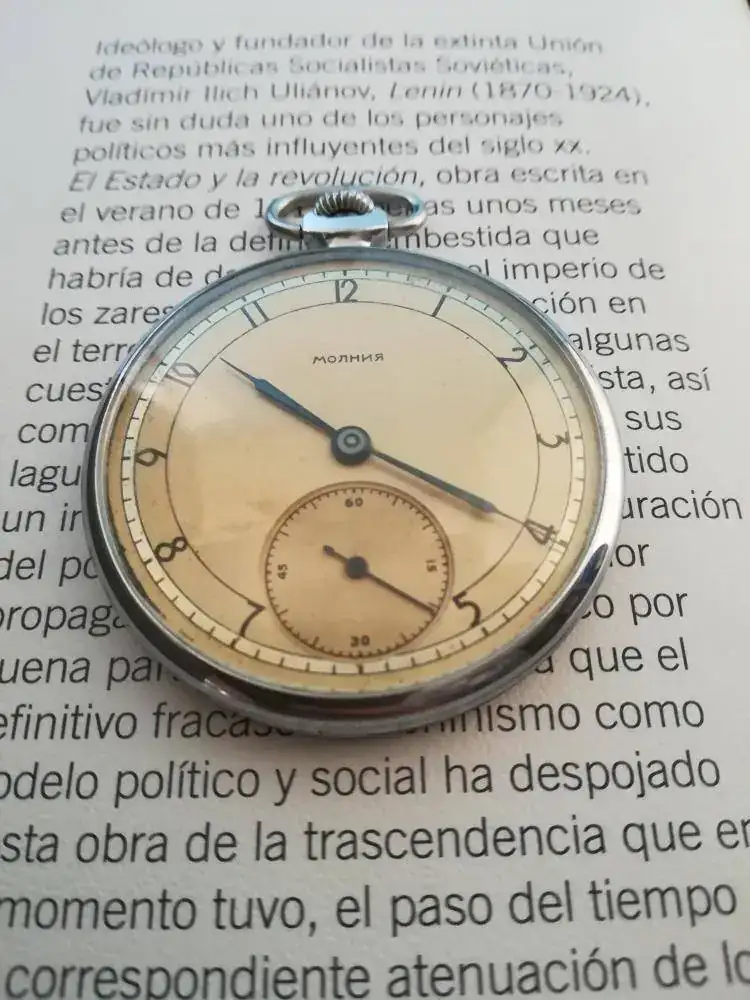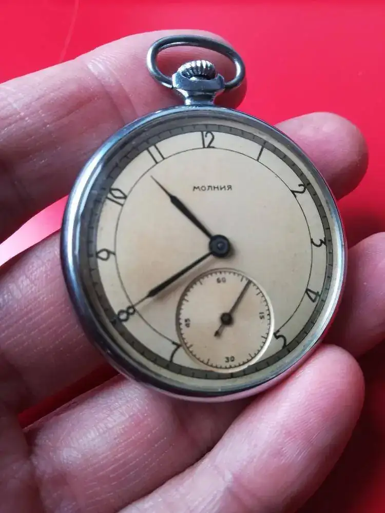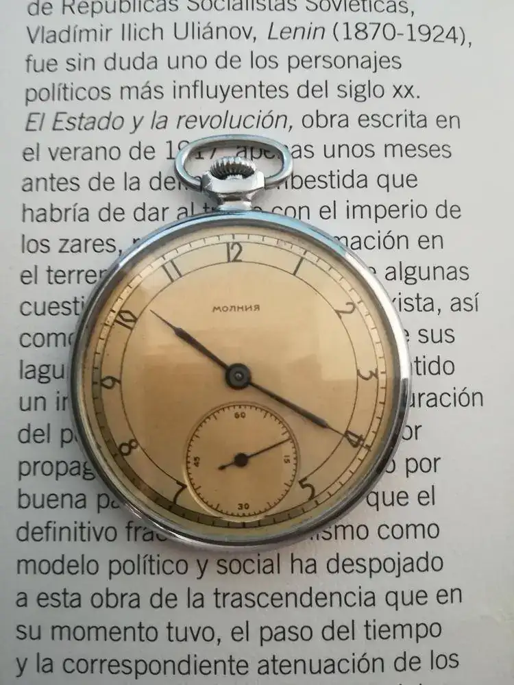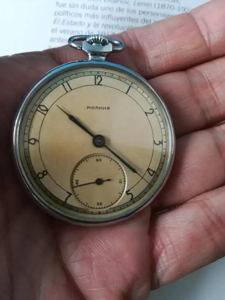 Vendo de mi colección este bonito reloj de bolsillo Molnija. Se trata de un reloj fabricado en la antigua Unión soviética en el año 1951 en la factoría de Chelyabinsk. Se trata de un movimiento de 15 jewls que basicamente es una copia del movimiento Cortebert utilizados en los Rolex de los años 40.