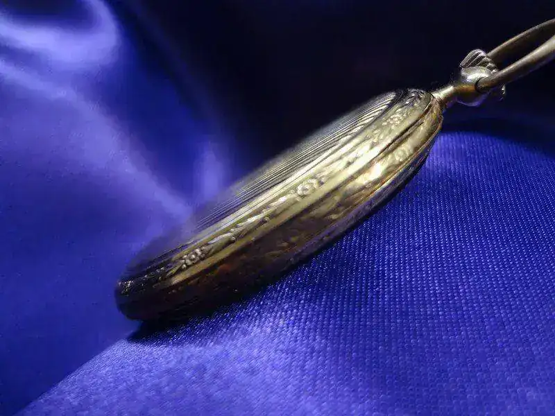 Caja de oro de 18k, con adornos en los cantos, con contraste en el interior. Tapa trasera adornada a rayas. Con contraste en su interior, numerada 7364 630391. Guardapolvos de Oro de 18k con contraste en el interio, Con pequeña raya a las 2.