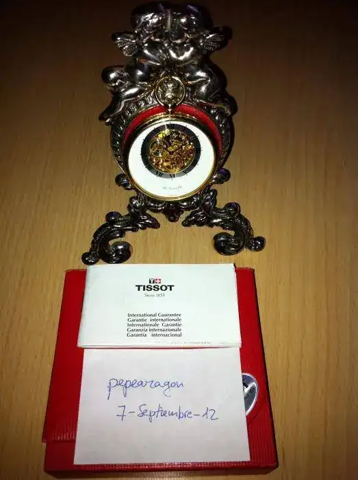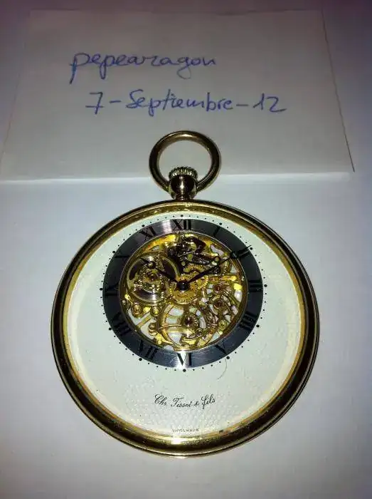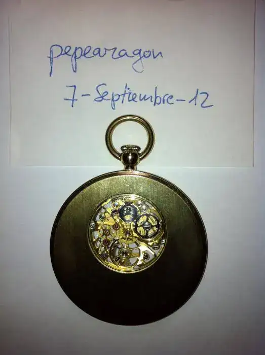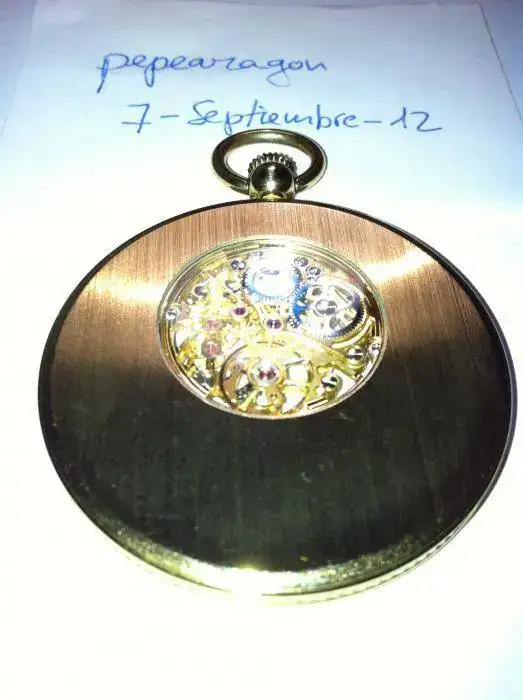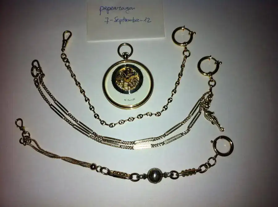 De cuerda manual, muy plano, dorado, caja de 45mm de diámetro, año 1999, muy bien conservado con escasas señales de uso. Caja y documentación. Se añade soporte de metal plateado y tres cadenas. La que venía con el reloj, dorada, una antigua, doble, de metal dorado y la tercera también antigua, de plata dorada, salvo bola central de plata en su color. Todo por sólo 250 euros con envío por correo certificado incluido. Saludos.