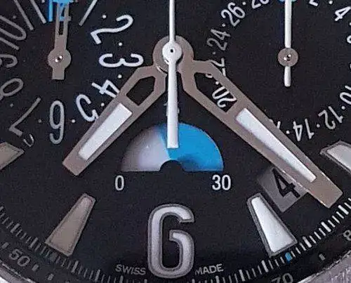 Indicador de marcha a las 6, mucha gente cree que es un segundero o un “reserva de marcha”, es un detector crucial en el buceo, nos indica al moverse que el reloj está funcionando, simplemente eso, no puedes estar a 50m o más de profundidad fiándote del reloj y resulta que está parado!!! En apnea puede significar un accidente gravísimo, incluso mortal.