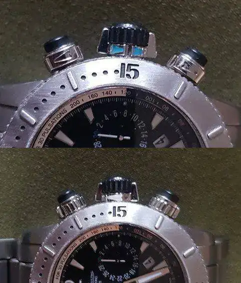Corona y pulsadores con llave seguridad, una vez que las giras se bloquean y ya no puedes sin querer manejarlas, muy fáciles de manejar incluso con los guantes puestos, al cerrarlas hacen sobrepresión en una de las cuatro membranas de la corona y en una de las tres membranas de los pulsadores del crono que aseguran la hermeticidad y la sobrepresión, las flechas te dicen hacia donde tienes que moverlas y si están abiertas o cerradas.