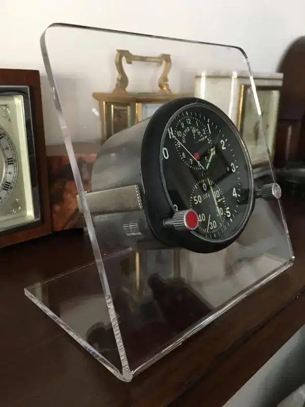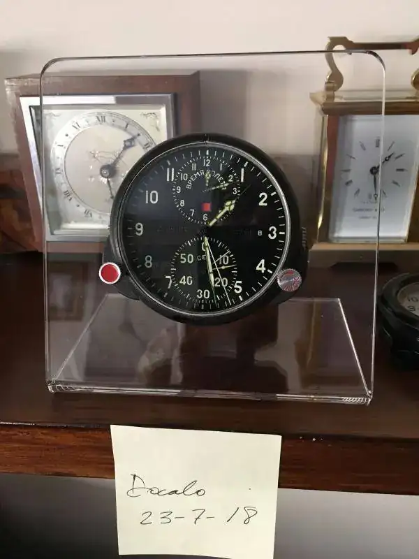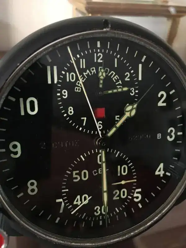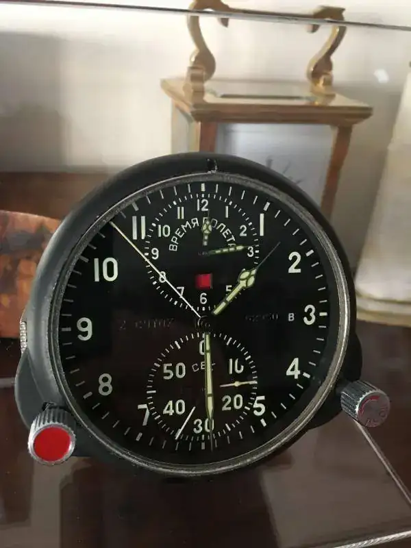 fabricado en la antigua Union Sovietica y utilizado en cazas Mig, cuerda de dos dias con parada de segundos y 25 rubies, horas de vuelo y cronografo completo con rueda de pilares, conexiones electricas para hacer funcionar una resistencia interior y evitar que se congele a temperaturas extremas, estado y funcionamiento excelente. nunca ha sido abierto y conserva sus sellos originales. relojes fabricados para el ejercito de calidad excepcional. 250€ con el envio incluido por mensajeria. soporte de metraquilato incluido.