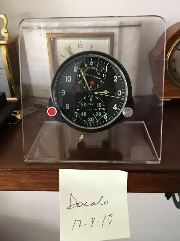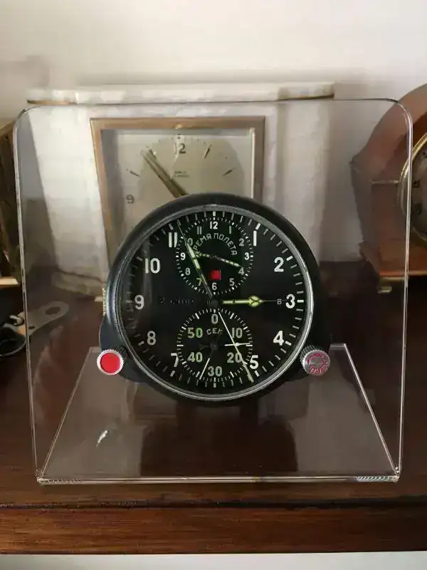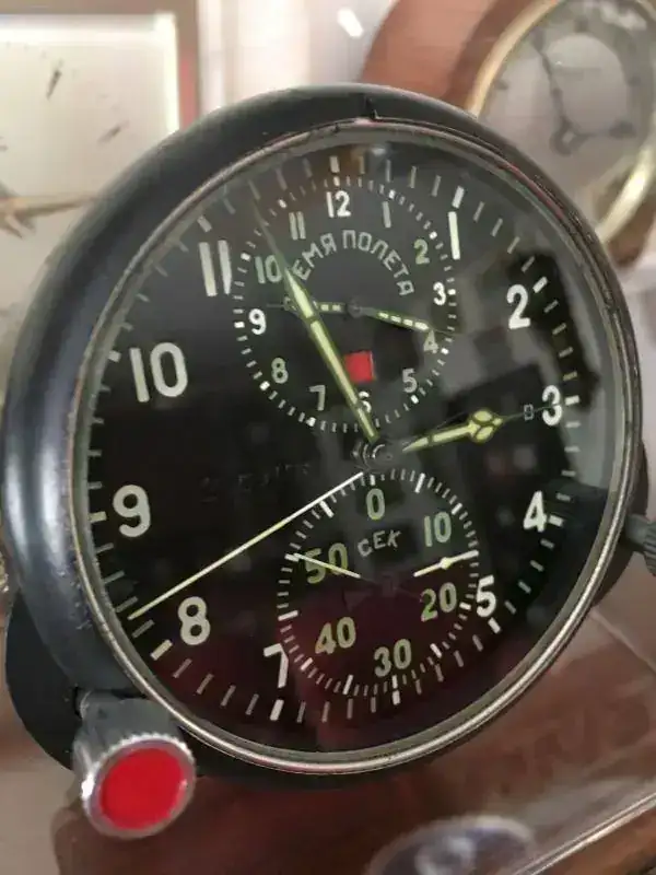 fabricado en la antigua Union Sovietica y procedente de un caza Mig 29, cuerda de dos dias con parada de segundos y 25 rubies, horas de vuelo y cronografo completo con rueda de pilares, conexiones electricas para hacer funcionar una resistencia interior y evitar que se congele a temperaturas extremas, estado y funcionamiento excelente. nunca ha sido abierto y conserva sus sellos originales. relojes fabricados para el ejercito de calidad excepcional. 250€ con el envio incluido por mensajeria. soporte de metraquilato de 5mm incluido.