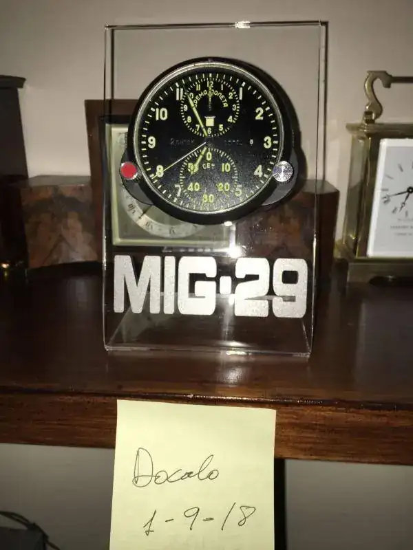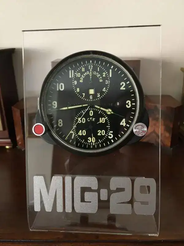 fabricado en la antigua Union Sovietica y procedente de un caza Mig 29, cuerda de dos dias con parada de segundos y 25 rubies, horas de vuelo y cronografo completo con rueda de pilares, conexiones electricas para hacer funcionar una resistencia interior y evitar que se congele a temperaturas extremas, estado y funcionamiento excelente. nunca ha sido abierto y conserva sus sellos originales. relojes fabricados para el ejercito de calidad excepcional. 250€ con el envio incluido por mensajeria. soporte de metraquilato de 5mm incluido.