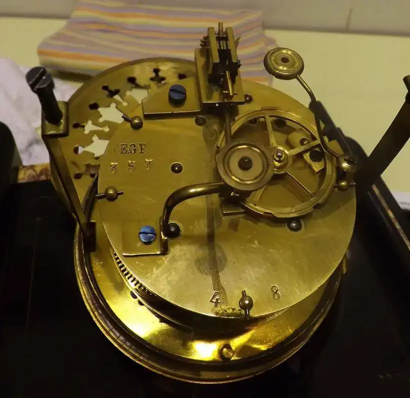El movimiento (Lleva grabadas las siglas E,G,P,) es de tipo París, con sonería de rueda contadora que da horas y medias sobre campana.