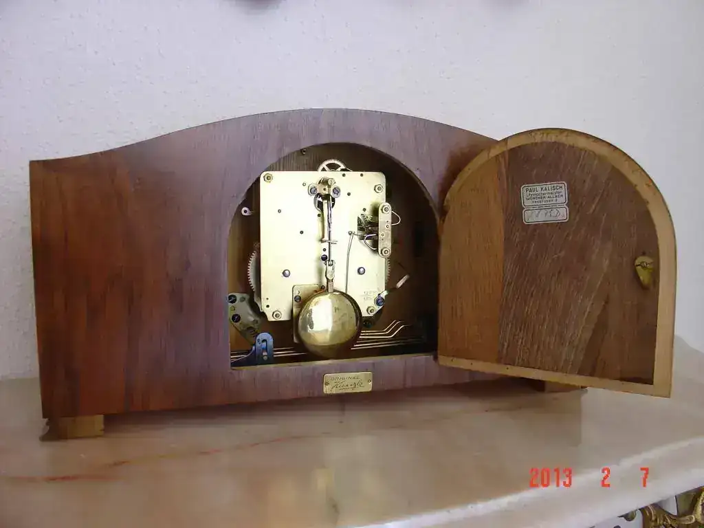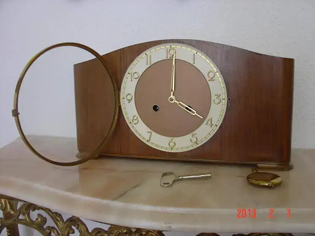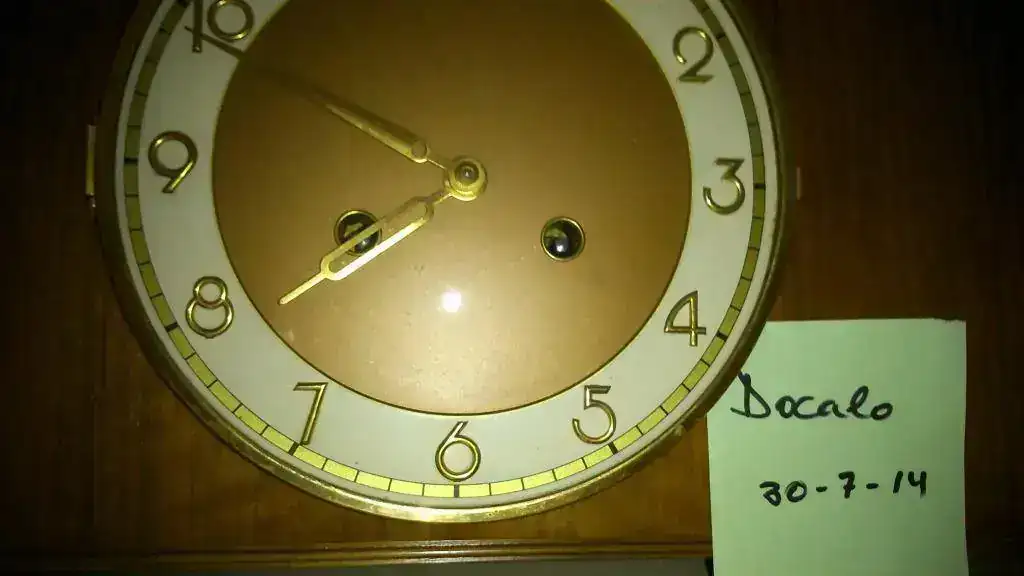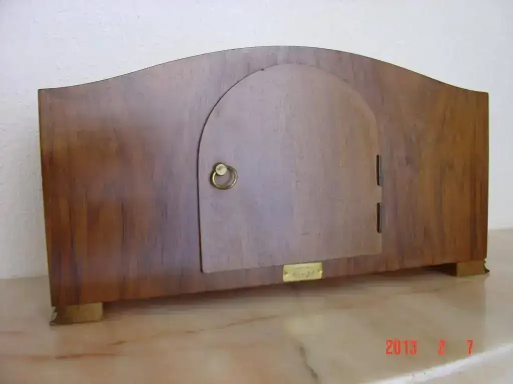reloj de chimenea fabricado en alemania en los años 40, maquinaria de cuerda de 8 dias con pendulo, soneria sobre varillas, estado muy bueno. mide 40x22 cm. 105€ con el envio incluido en españa por postal expres 24h. saludos.