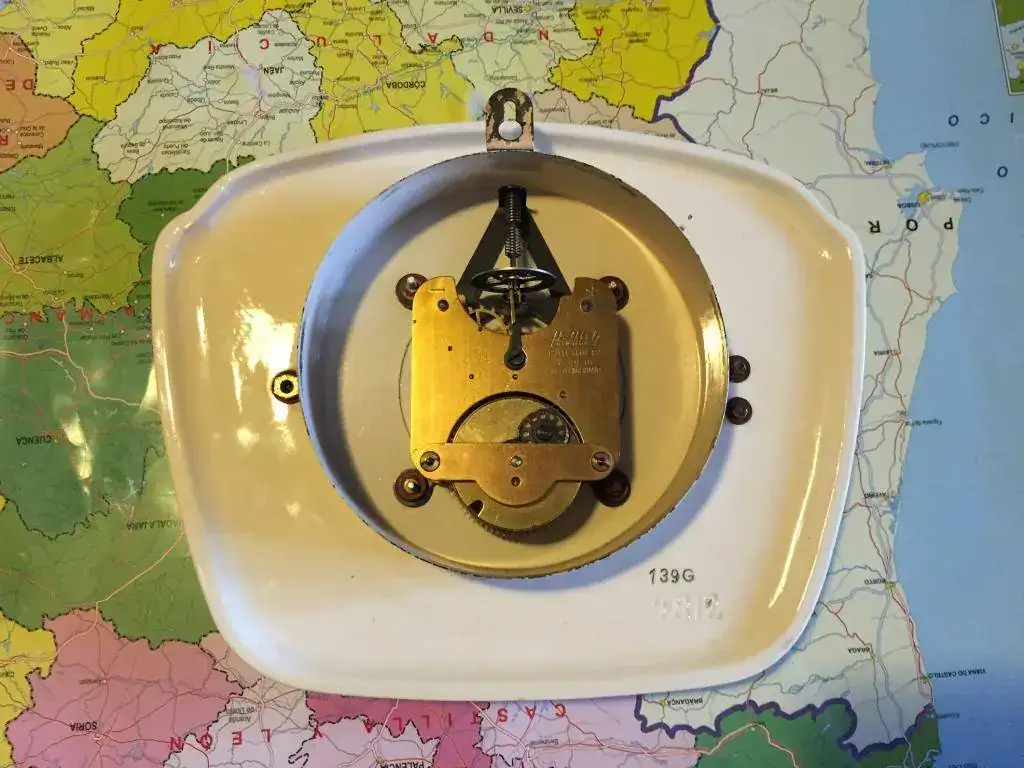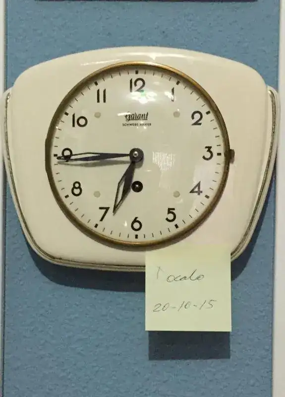 Reloj de cocina fabricado en Alemania en los años 50 en ceramica y puerta de cristal, maquinaria mecanica de cuerda de 8 dias, mide 25x20cm, estado y funcionamiento excelente.