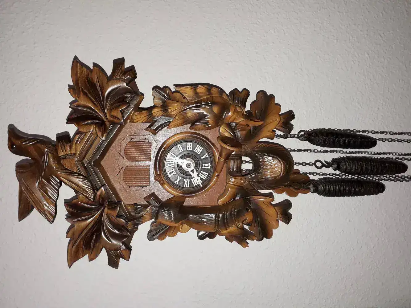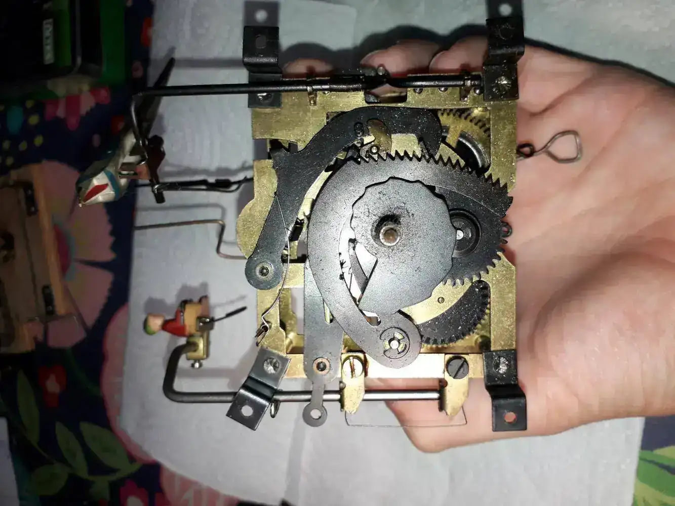 Una vez montada la maquinaria la monté en el reloj y lo puse en funcionamiento. Ahora el reloj funciona bien, no se para, pero el problema que tiene es que cuando suena el cuco a las horas, mientras esta sonando, en la penúltima campanada se cierra y se vuelve a abrir la puerta del cuco. A las medias va bien. Por ejemplo si son las 9, el cuco suena 9 veces pero en la campanada número 8 se cierra y abre la puerta del cuco, da la campanada 9 y ya se cierra la puerta.