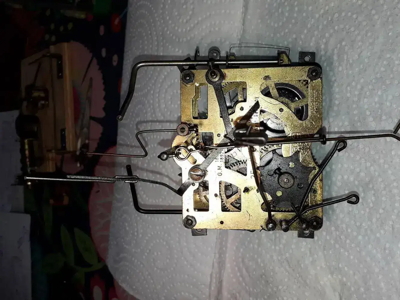 Desmonté todo el reloj y desguacé la maquinaria, limpiándola con líquido ELMA 1:9. Una vez bien limpia, procedí a secar bien todas las ruedas y las platinas de la maquinaria y procedí a montarla.