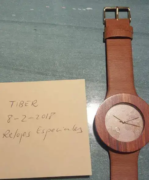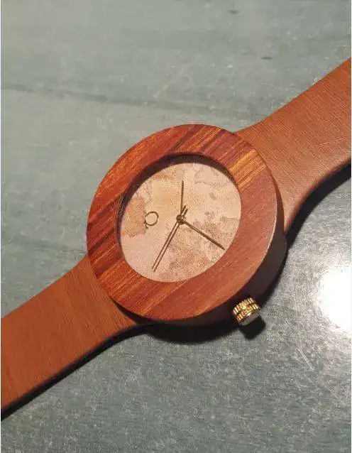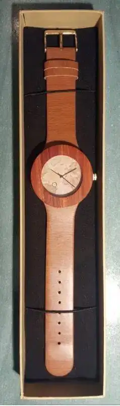 Caja circular de madera natural, y fondo con mapa. Correa de piel simulando madera.