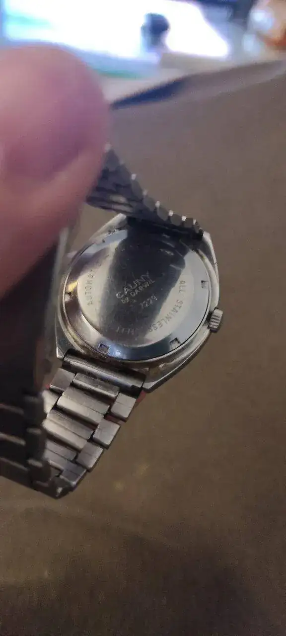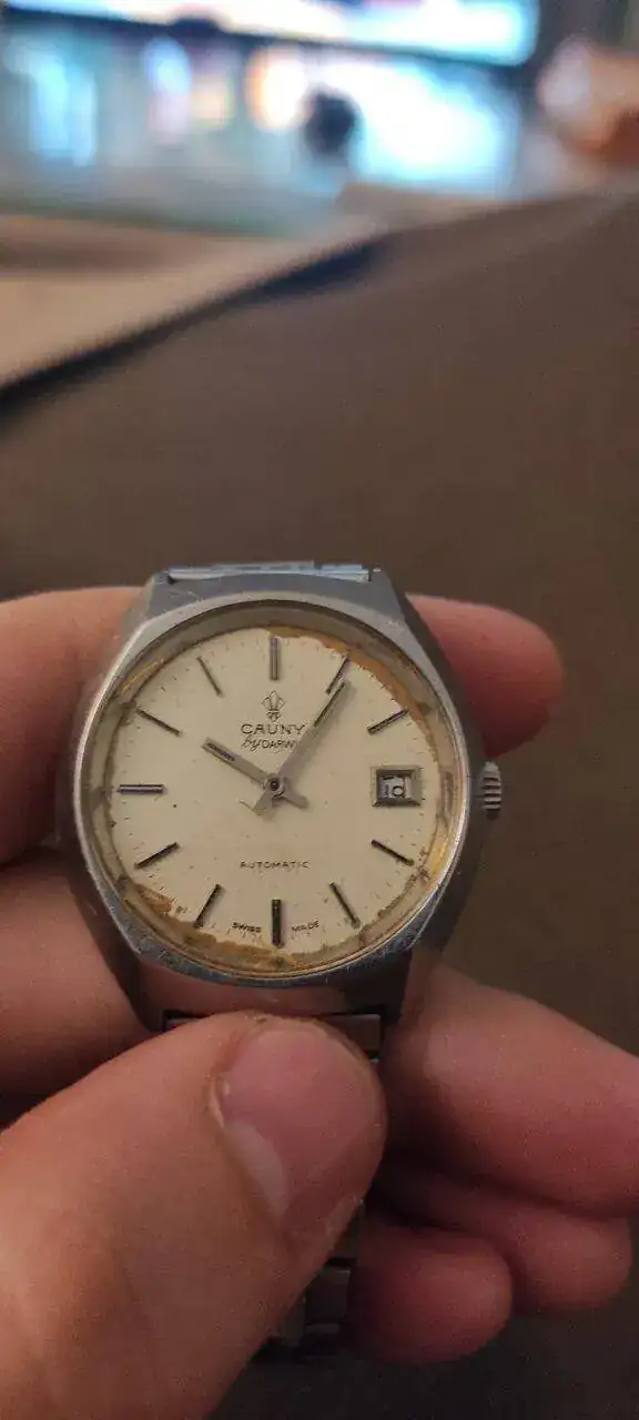 Buenas a todos!! Hoy encontré un reloj de mi abuelo marca cauny modelo 7229, no he encontrado nada en internet respecto a este reloj, y quería saber si puede merecer la pena repararlo, ya que se adelanta bastante y tiene cemento (o eso creo) hasta por dentro de la esfera.