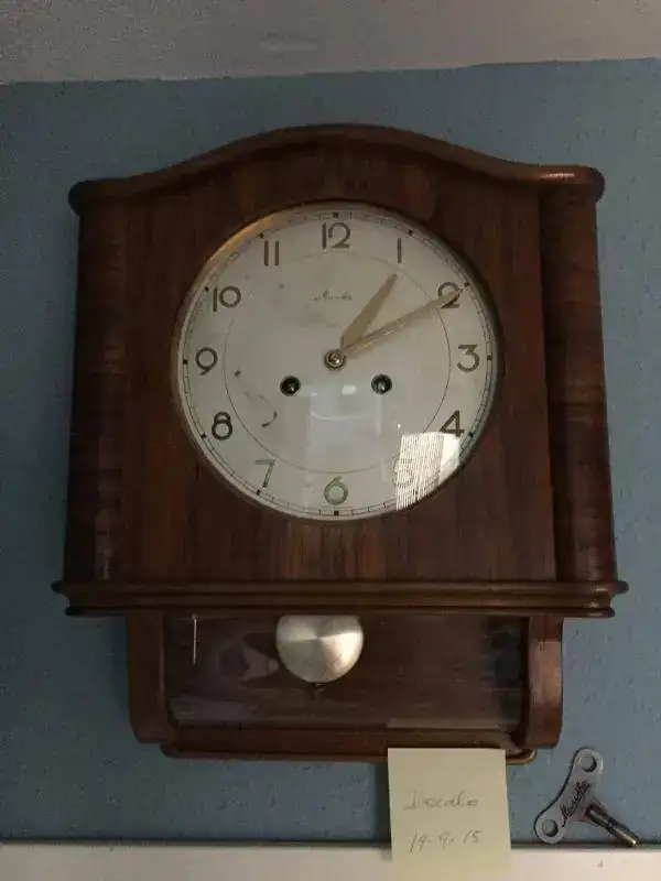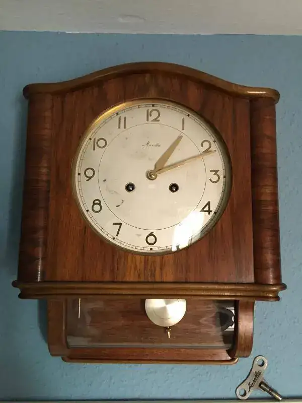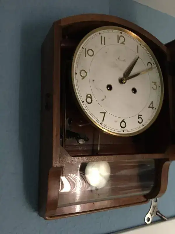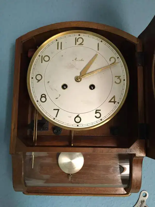 Reloj de pared mauthe fabricado en alemania en los años 50, todo un clasico con su cristal curvado, dificil de conseguir. maquinaria mecanica de cuerda de 8 dias con soneria sobre varillas, mueble en madera de roble maciza en un estado excelente, la esfera un poco manchada, llave original, mide 42x34cm. funcionamiento excelente. 175€ con el envio incluido por nacex 24h.