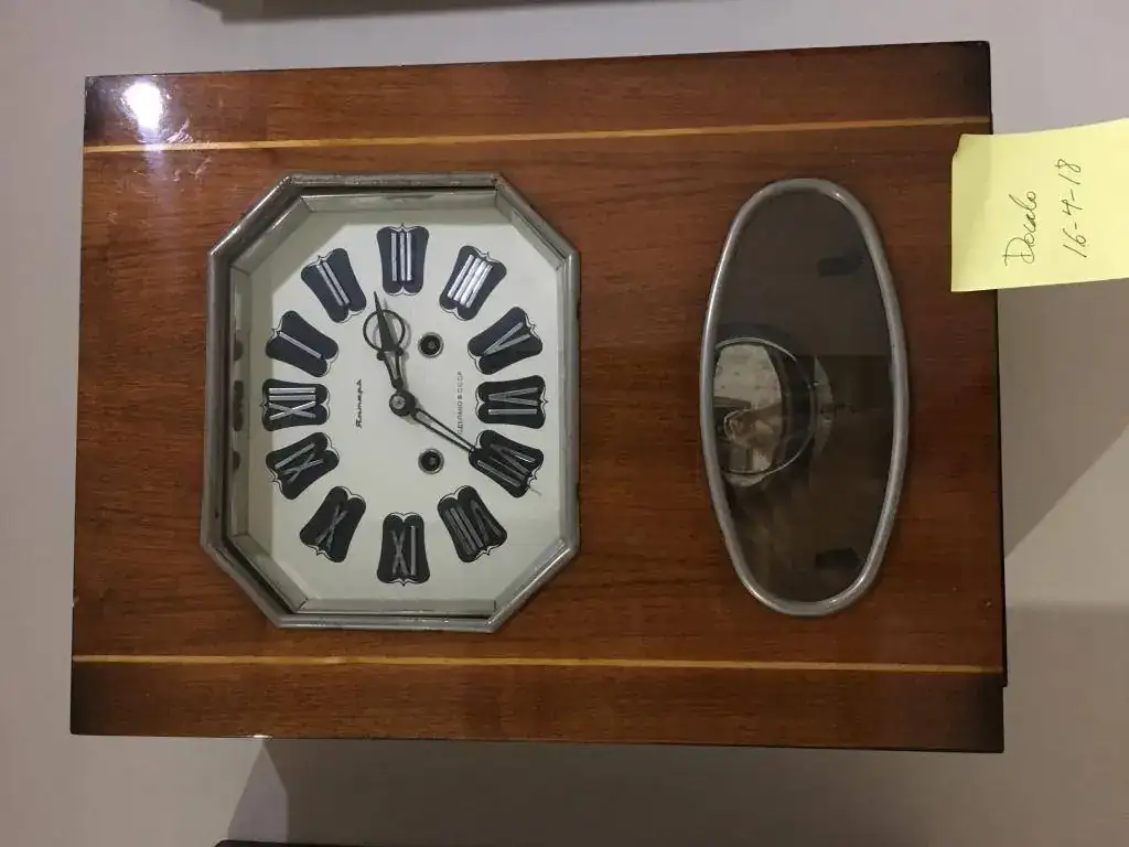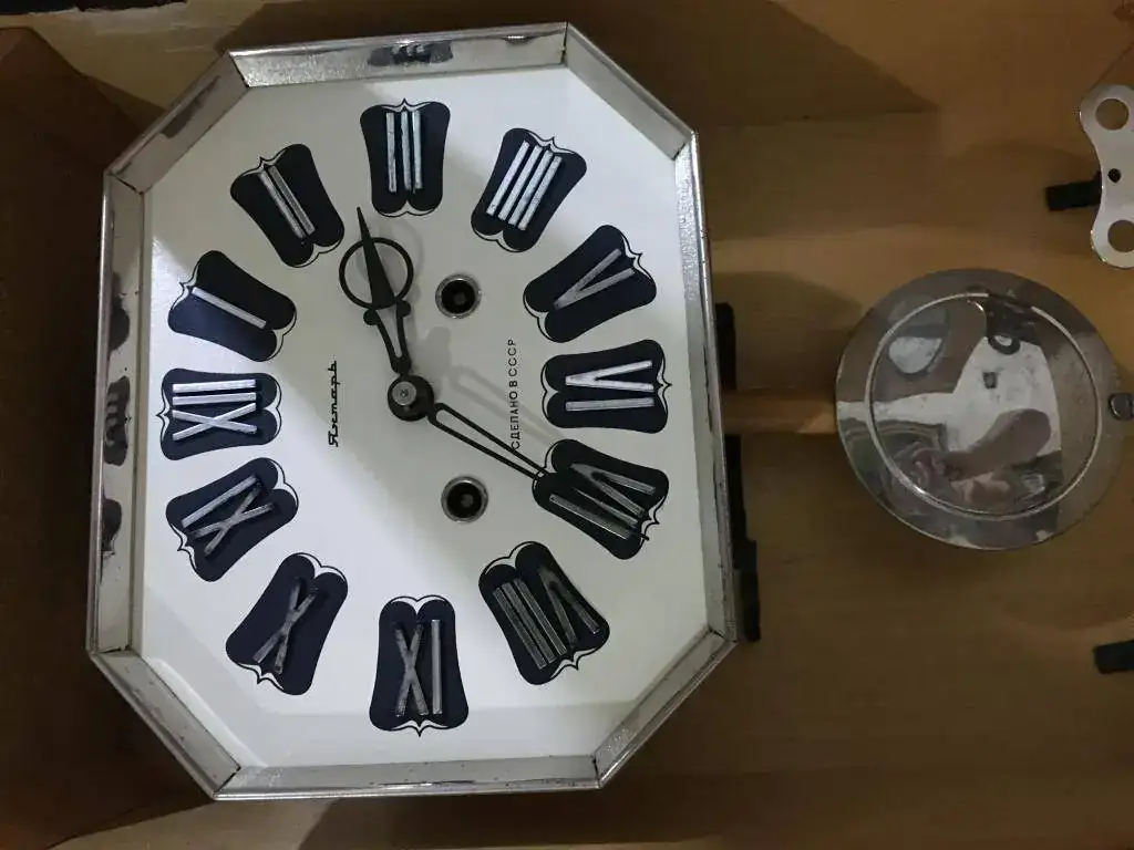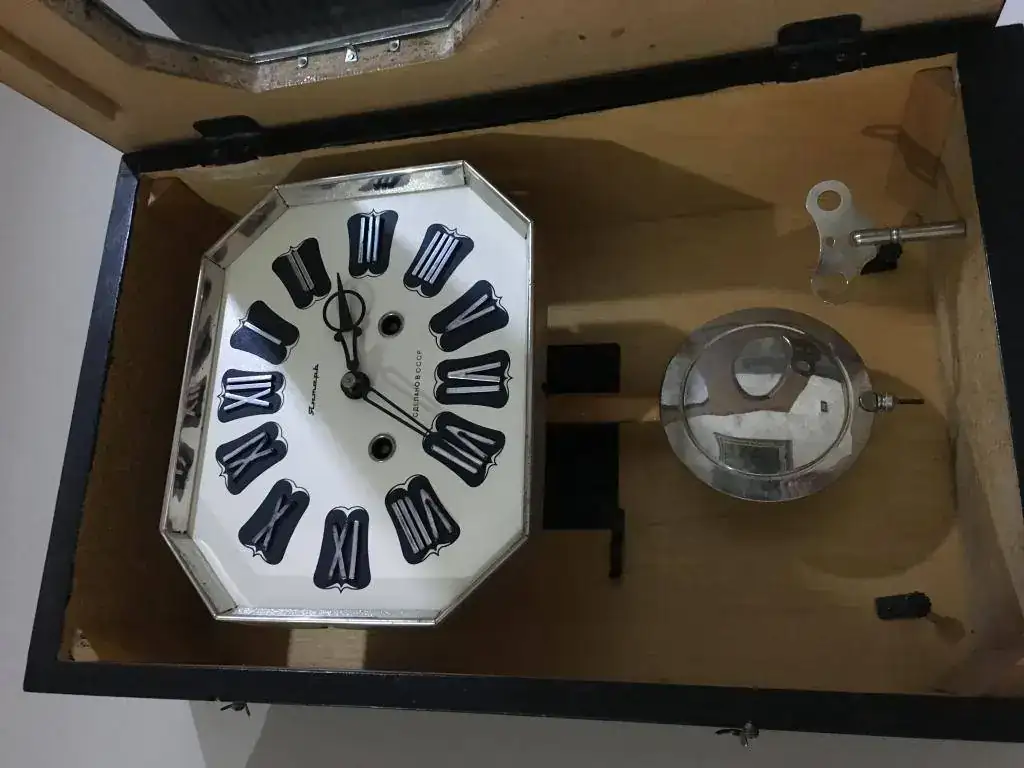 Fabricado en la antigua URSS, sin concesiones a la belleza pero con una maquinaria robusta y exacta, cuerda de 8 días con soneria en horas y medias. Mide 47x34cm. Funciona perfectamente. 85€ envio incluido por mensajeria.