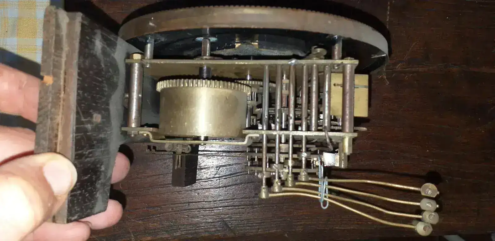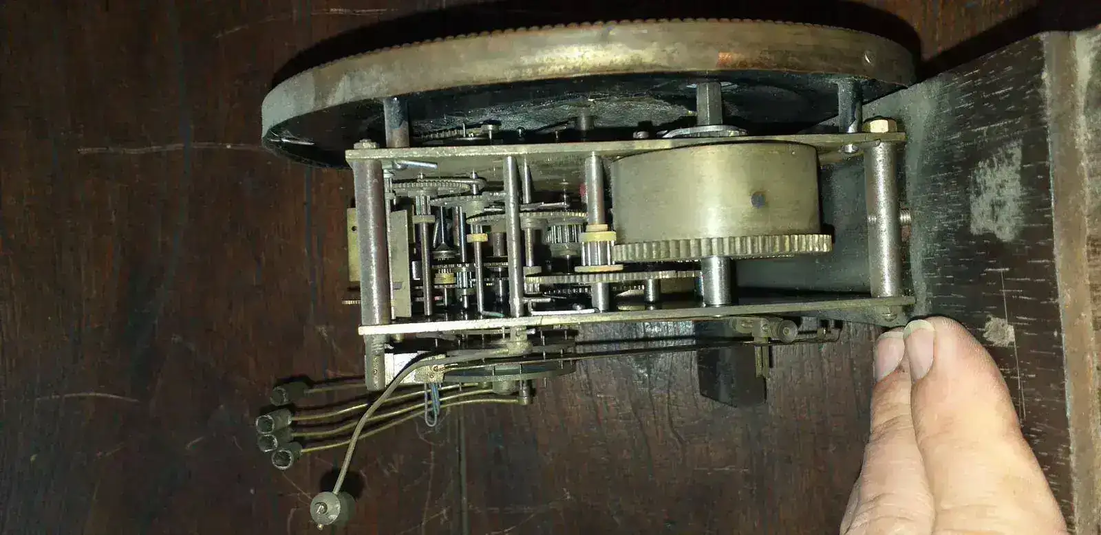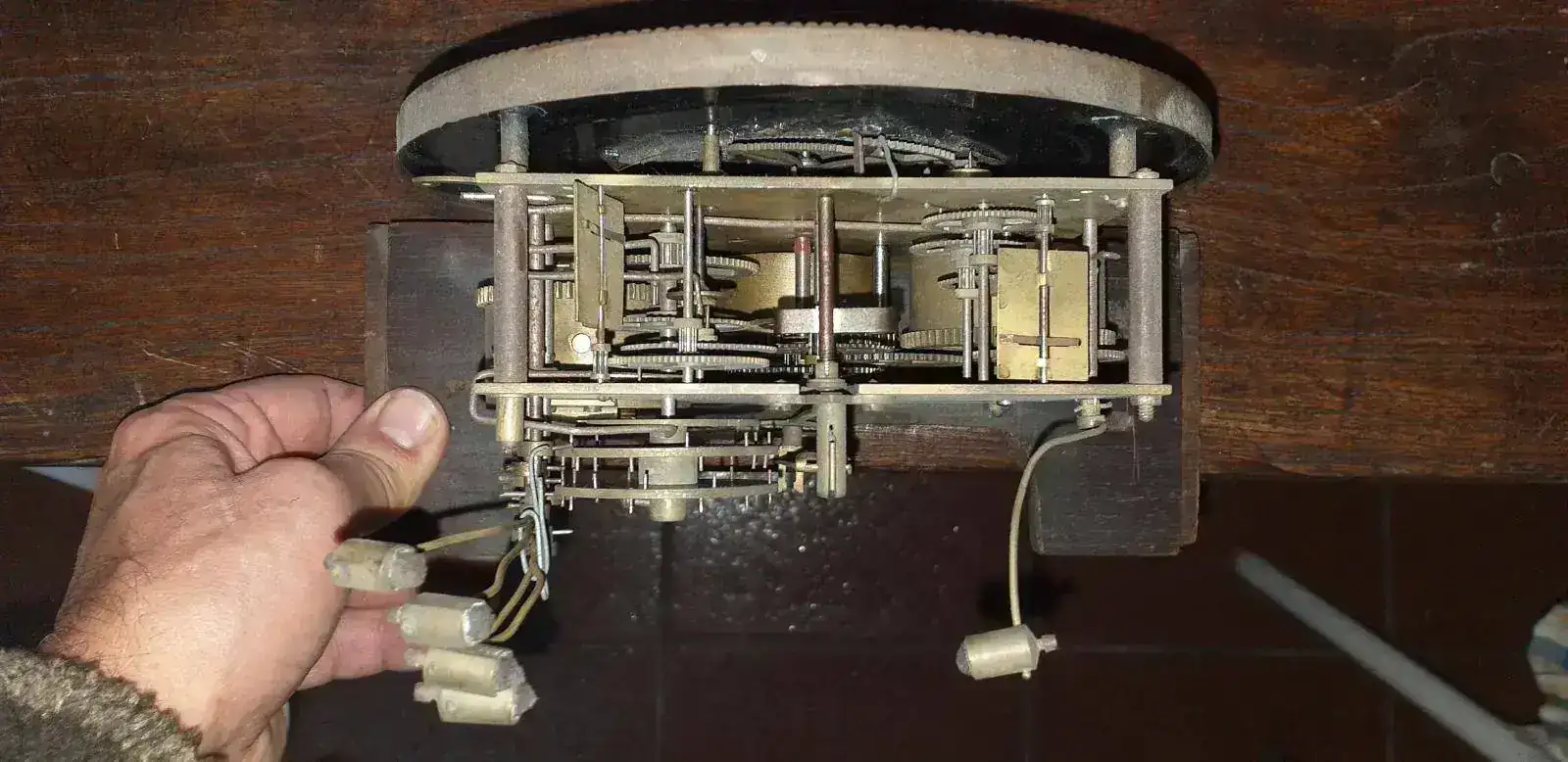 Soy un aficionado que ya desarme un par de relojes de pared para limpiarlos (los cuales andaban y estaban completos) y los rearme con éxito, este nuevo proyecto me preocupa por cuanto no tengo idea si falta alguna pieza y si las que tiene están correctamente montadas, les solicito tengan a bien orientarme para poder darle vida otra vez a esta pieza.