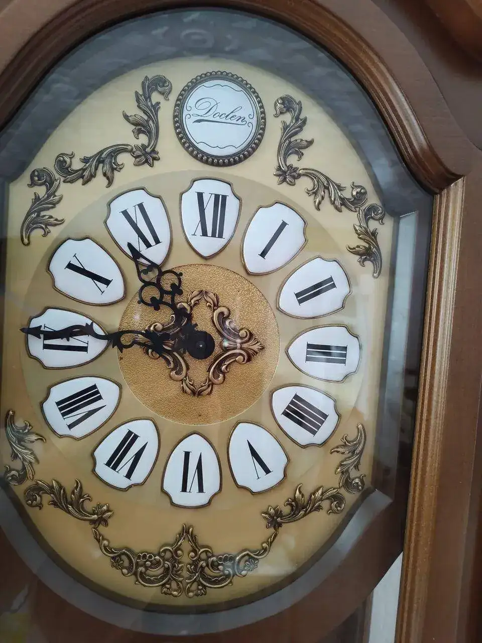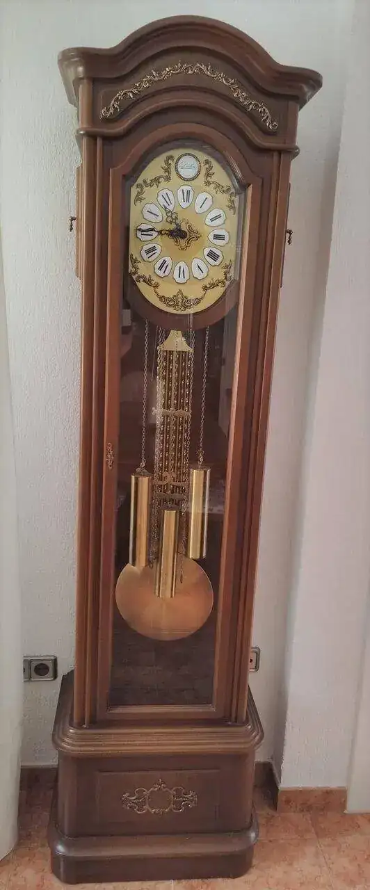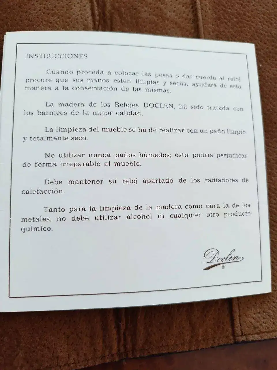 Tengo dos dudas sobre este reloj de pie Doclen, fabricado en Cheste (Valencia), la primera es saber que origen tiene el mecanismo, la otra es constatar que la mayoría de relojes de pared al caerse las pesas rompen el panel inferior de madera como es mi caso y se ve directamente el suelo.