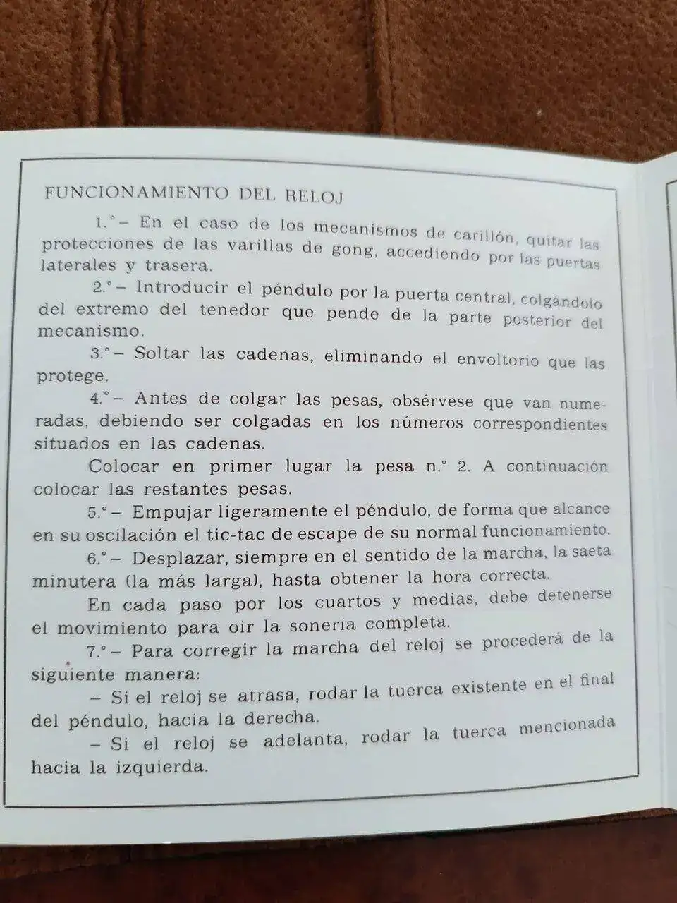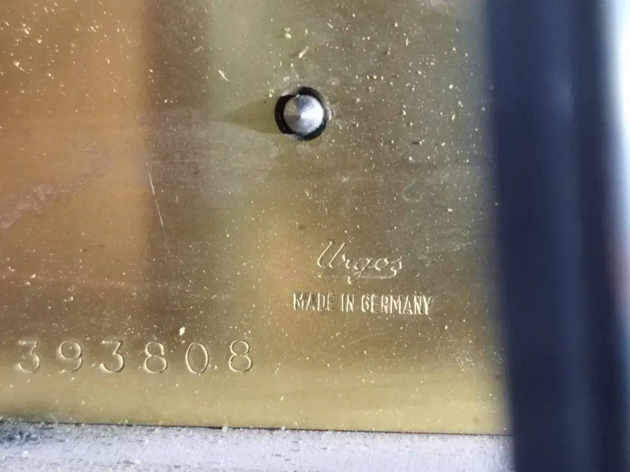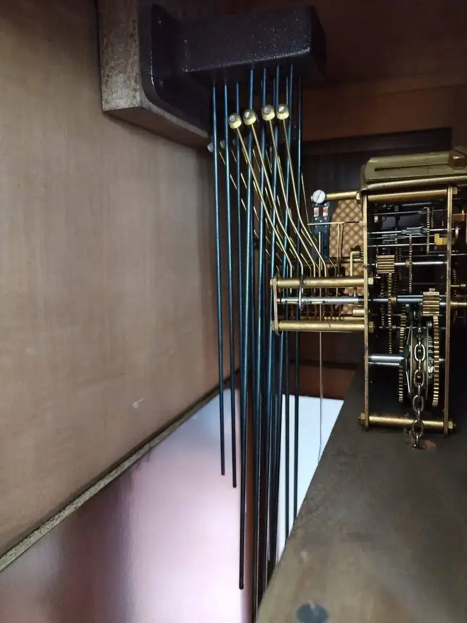 Tengo dos dudas sobre este reloj de pie Doclen, fabricado en Cheste (Valencia), la primera es saber que origen tiene el mecanismo, la otra es constatar que la mayoría de relojes de pared al caerse las pesas rompen el panel inferior de madera como es mi caso y se ve directamente el suelo.