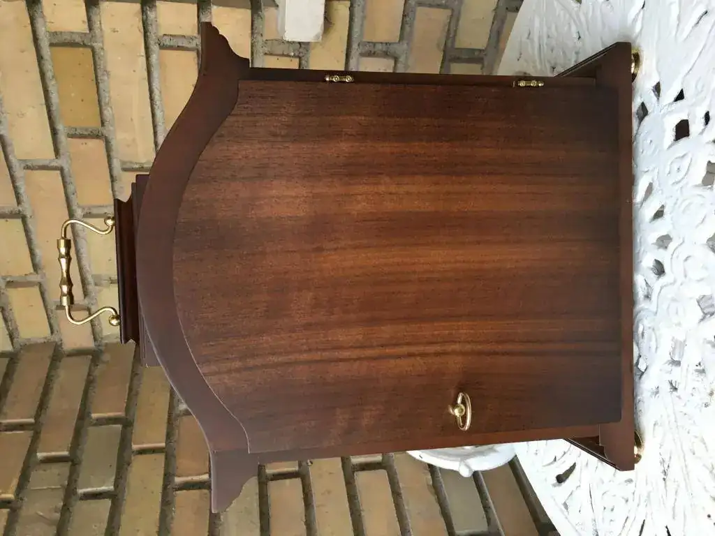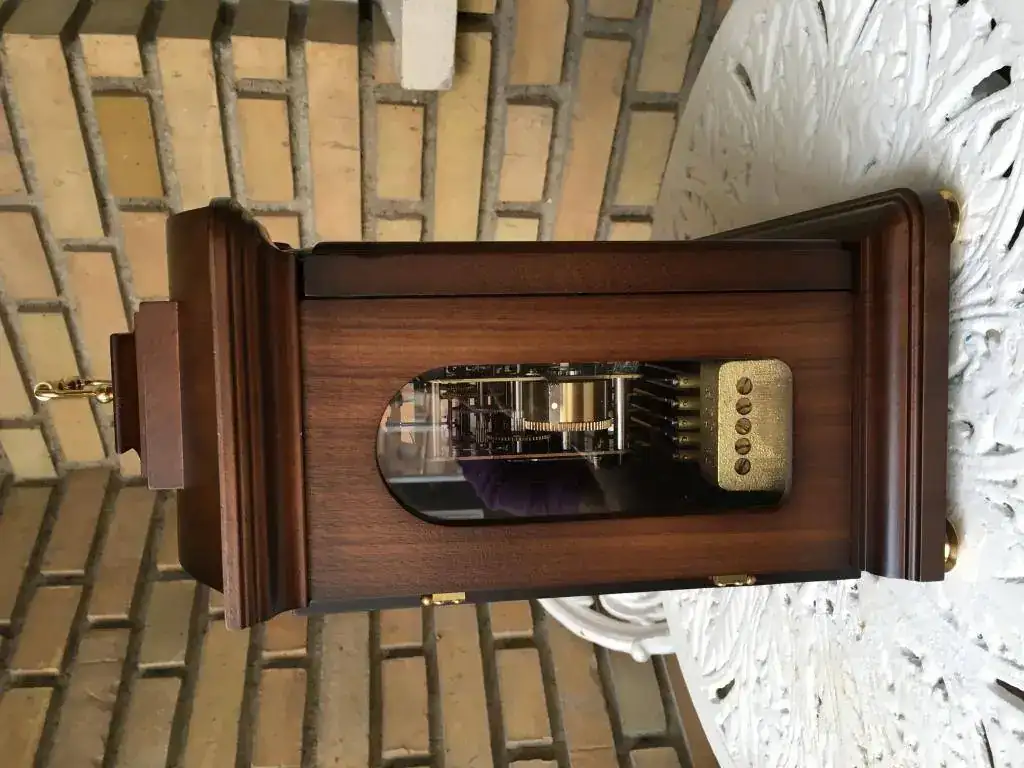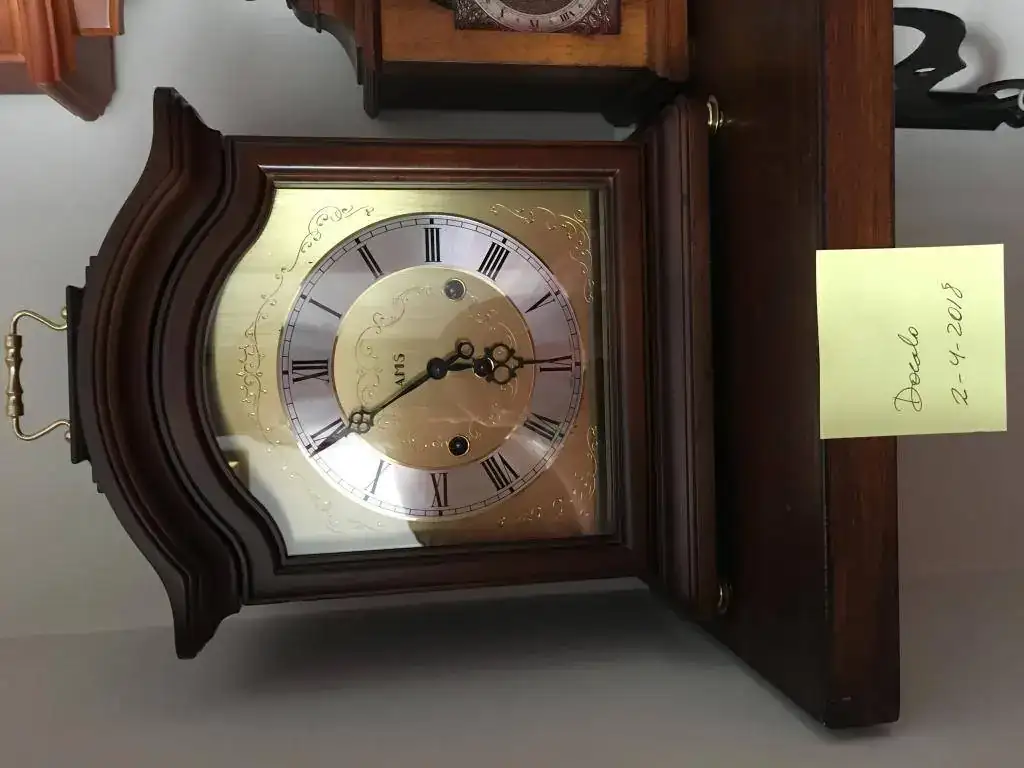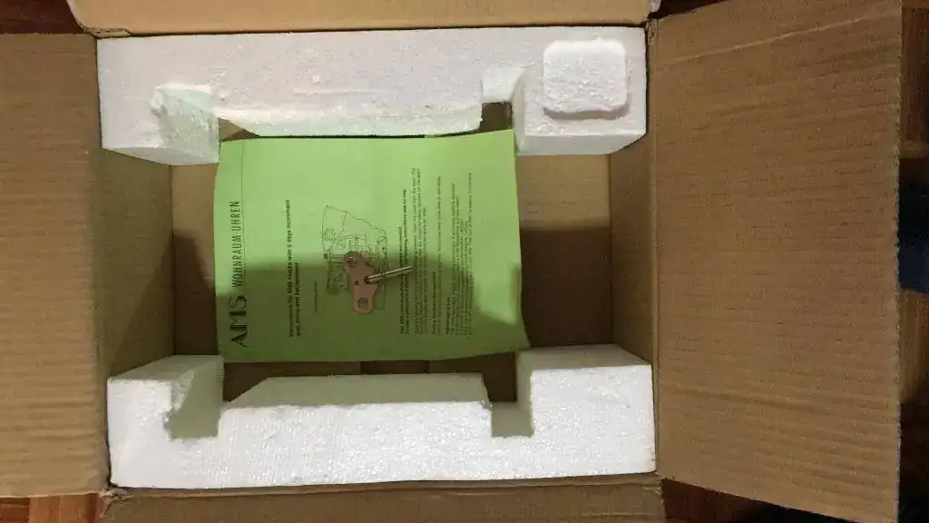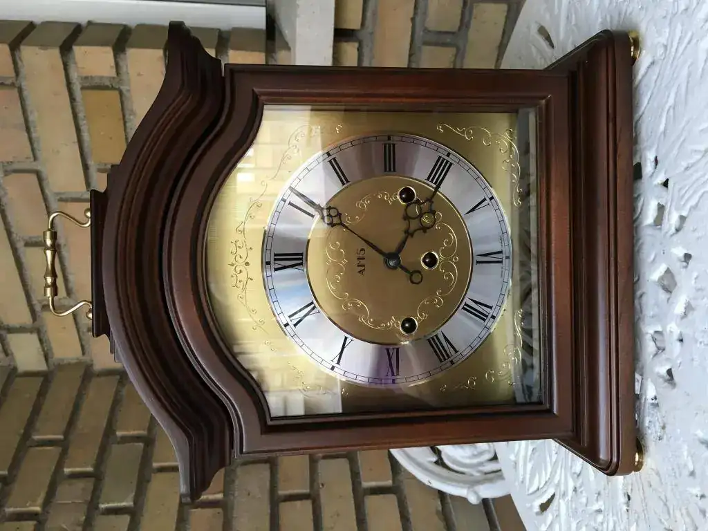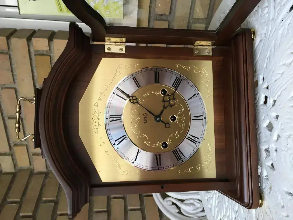 Reloj fabricado en Alemania por AMS, caja de madera maciza de nogal, maquinaria mecanica de cuerda de 8 dias con soneria westminster en todos los cuartos, palanca de desconexion de la soneria. Nuevo nunca usado en su caja original e instrucciones y llave. Mide 36X26X15cm. Funcionamiento perfecto.