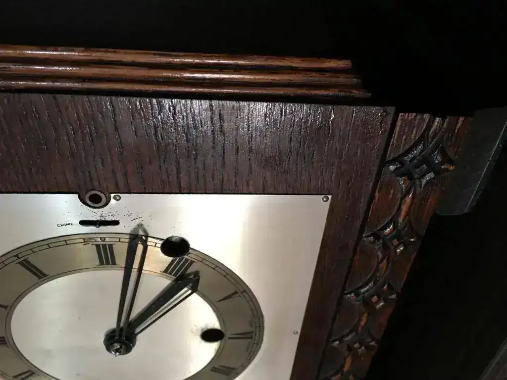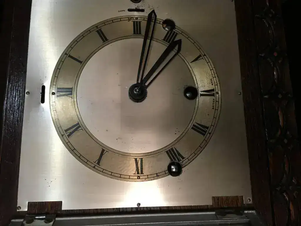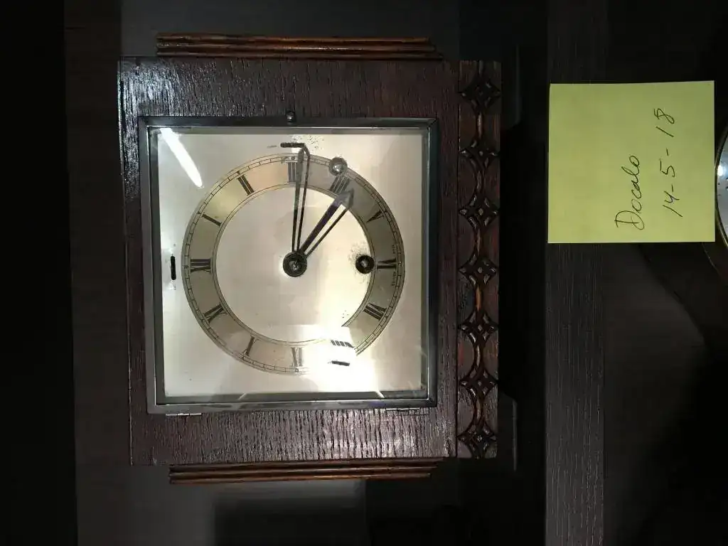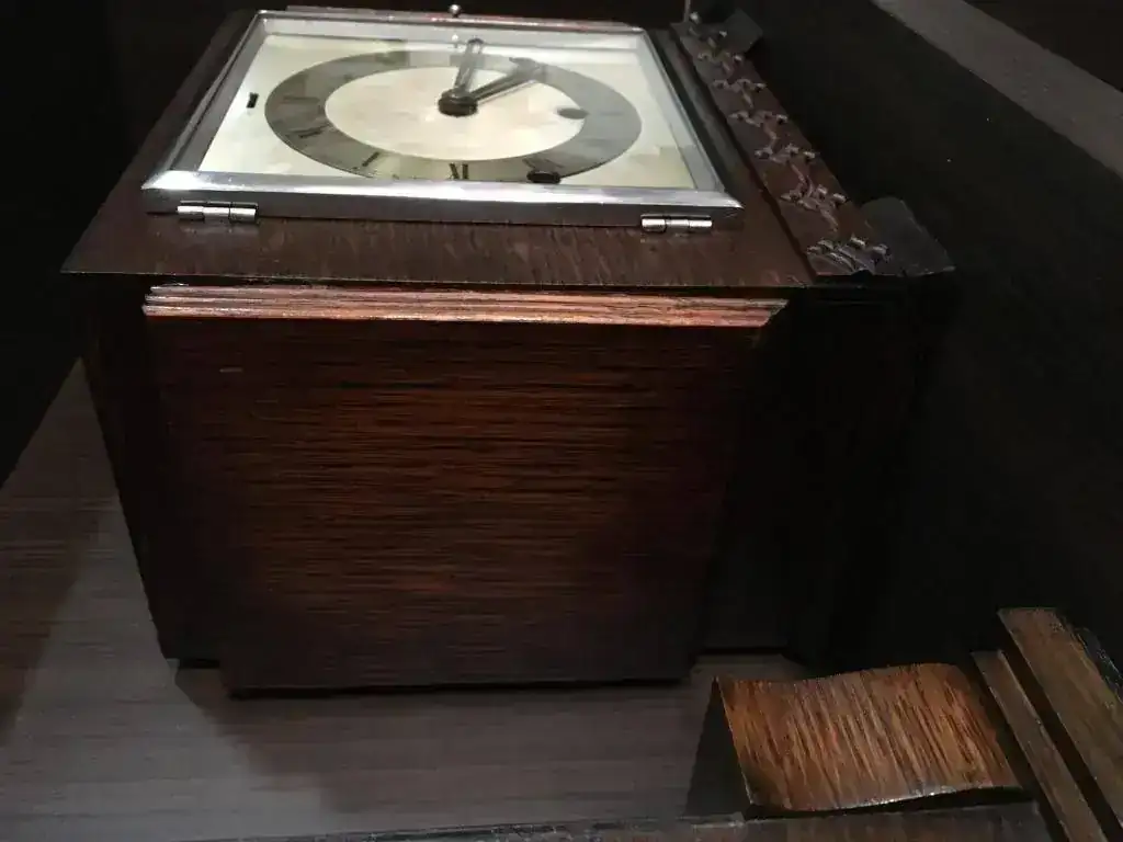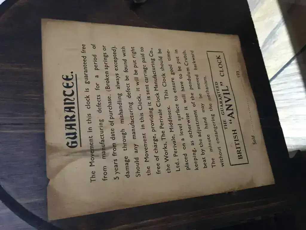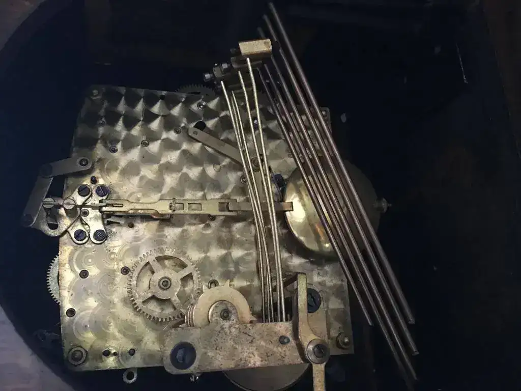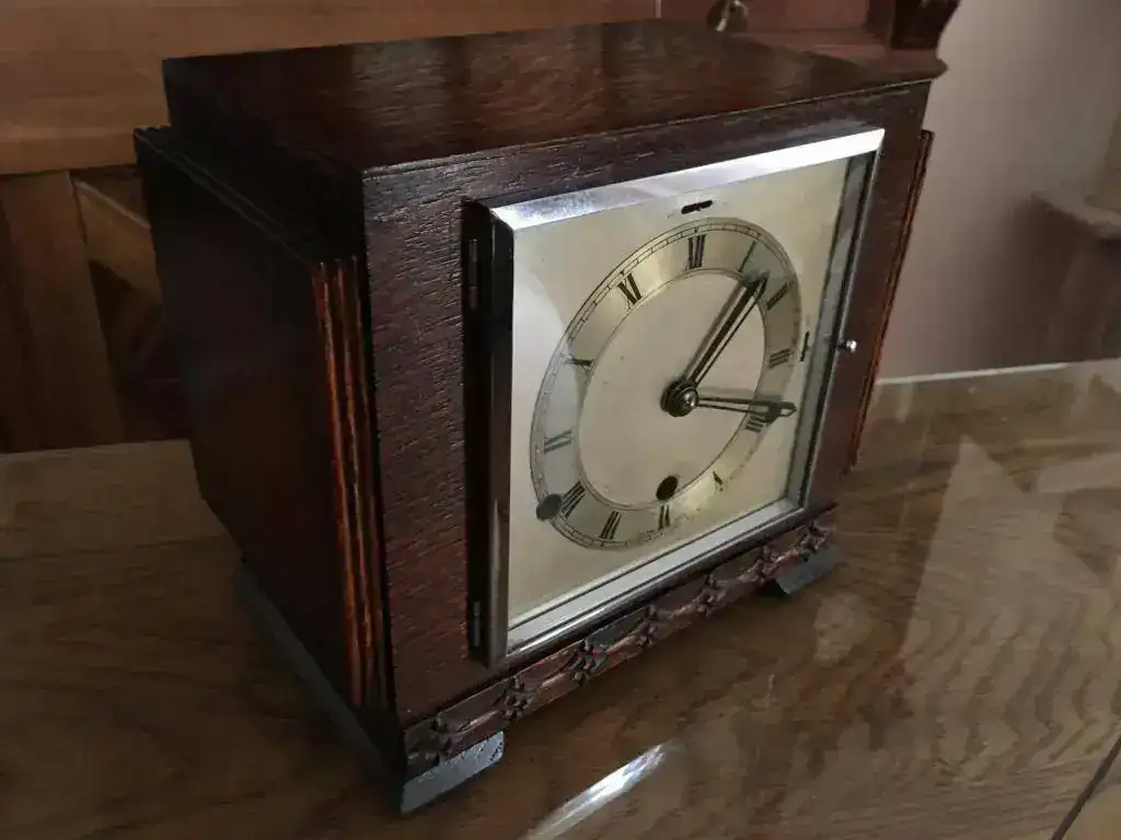 Reloj fabricado en Reino Unido en los años 30 por la prestigiosa Anvil , maquinaria mecánica de cuerda de 8 días con escape por pendulo y soneria carrillon westminster, pletinas pulidas y decoradas, sistema de corregir la marcha desde el dial y desconexion de la soneria. Es un reloj grande y pesado que denota mucha calidad. Estado excelente, funcionamiento perfecto . Mide 25x22x15cm. Reloj revisado, maquinaria limpia y aceitada. precio 150€