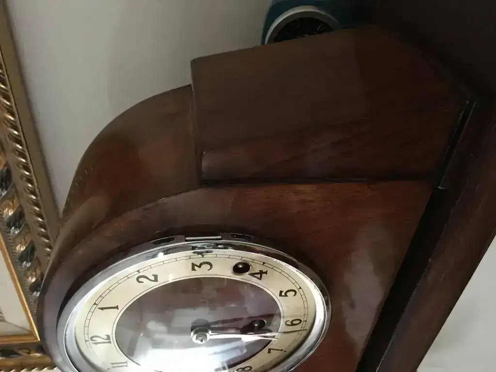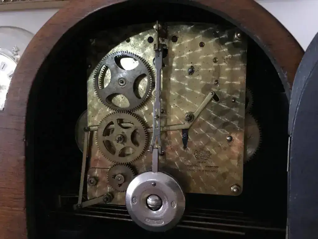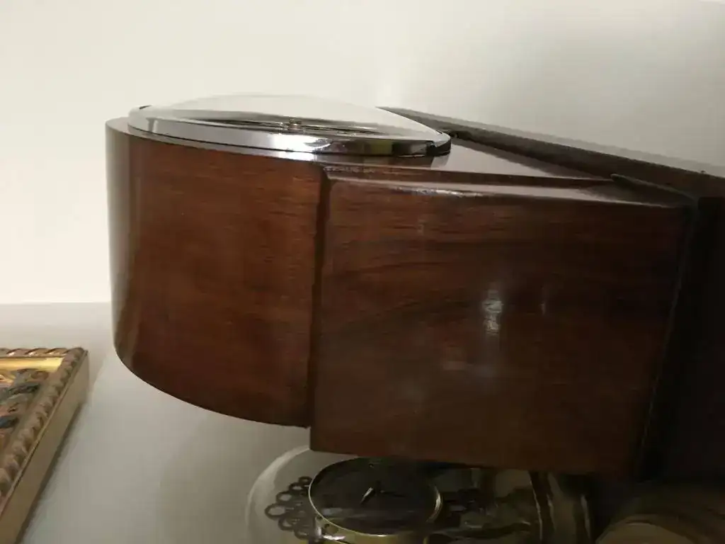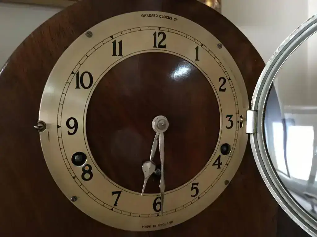Reloj fabricado en Reino Unido en los años 40 por la prestigiosa Garrard, maquinaria mecánica de cuerda de 8 días con escape por pendulo y soneria carrillon westminster, pletinas pulidas y decoradas, pendulo cromado. Estado excelente, funcionamiento perfecto . Mide 23x21cm. Reloj revisado, maquinaria limpia y aceitada. 150€