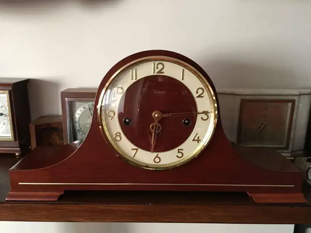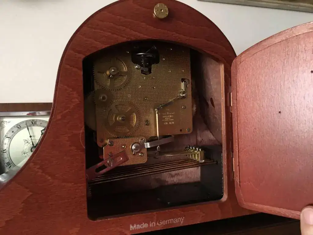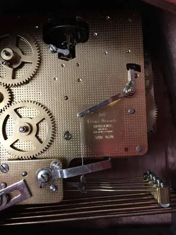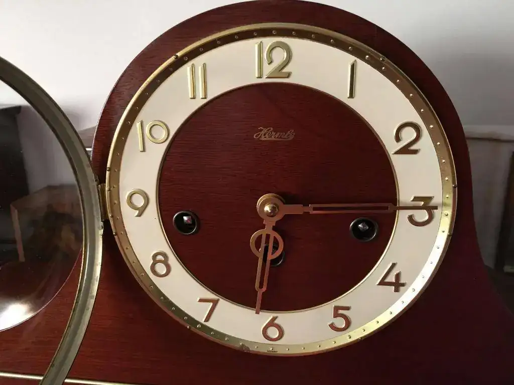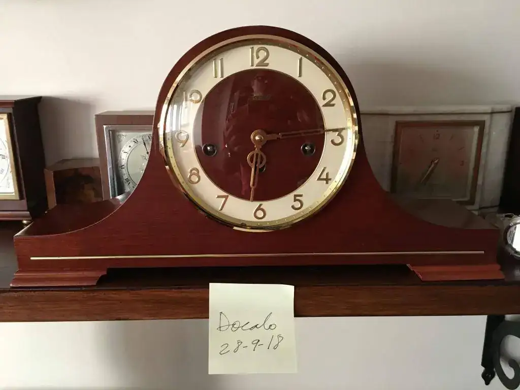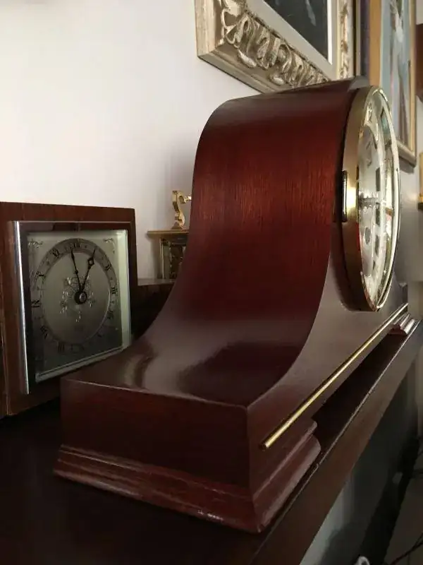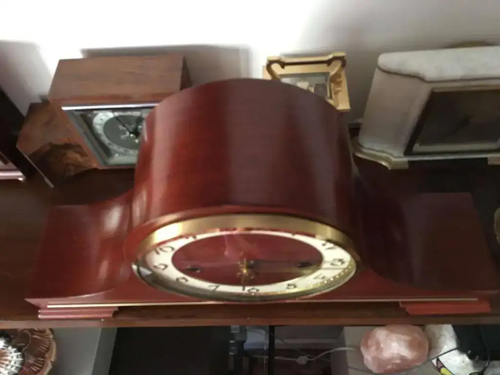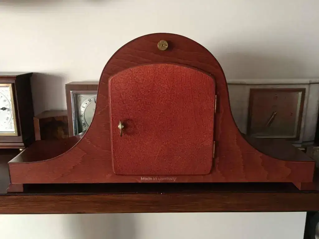 Reloj de sobremesa fabricado en Alemania en 1984. Maquinaria Hermle carrillon tocando todos los cuartos y las horas con la melodía Westminster, palanca para desconexion de soneria. maquinaria mecanica de cuerda de 8 dias con escape flotante . Mide 43x20cm. Estado y funcionamiento excelente. 150€ envio incluido por mensajeria.